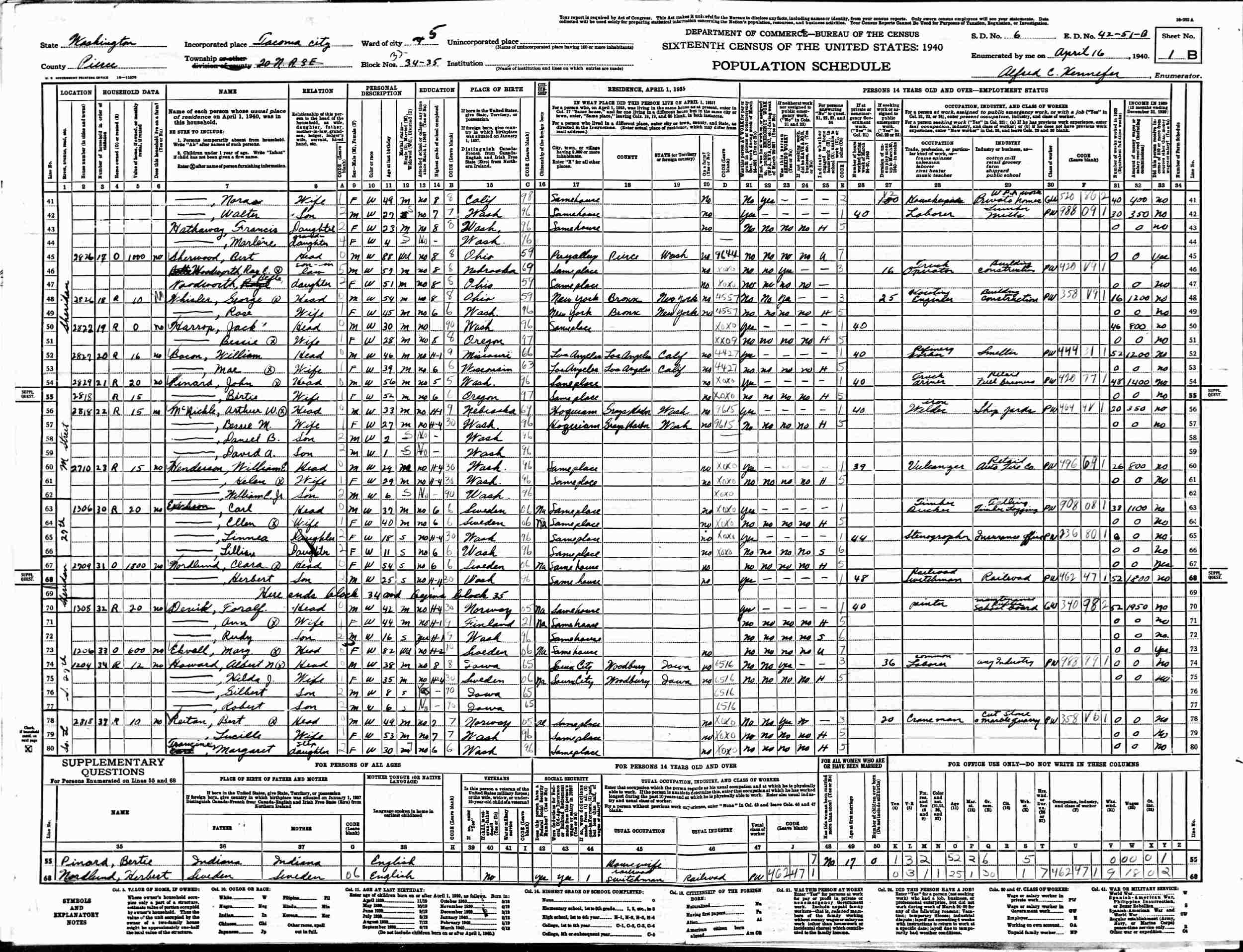 April 16, 1940 - 2709 Sheridan, Ward 5, Blocks 33-35, Supervisor's District 6, Enumeration District 42-51B, Tacoma, Pierce County, Washington.
