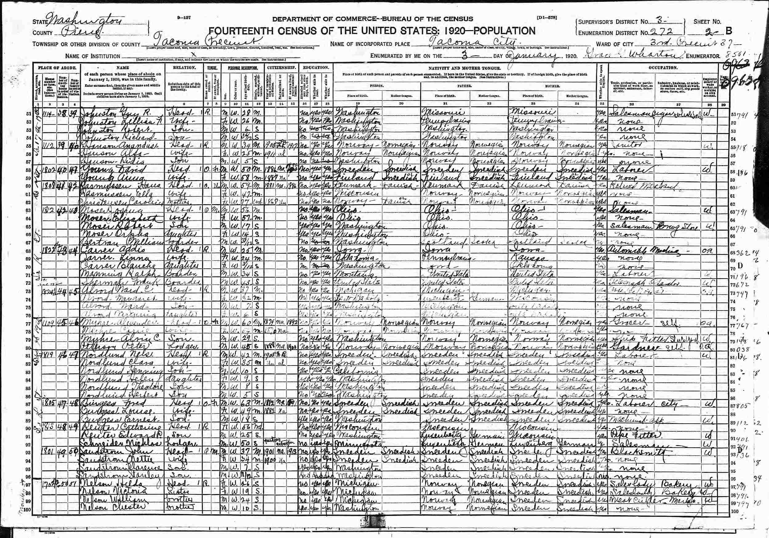 January 3, 1920 - 1819 South L, Ward 3, Precinct 37, Supervisor's District 3, Enumeration District 272, Tacoma, Pierce County, Washington.
