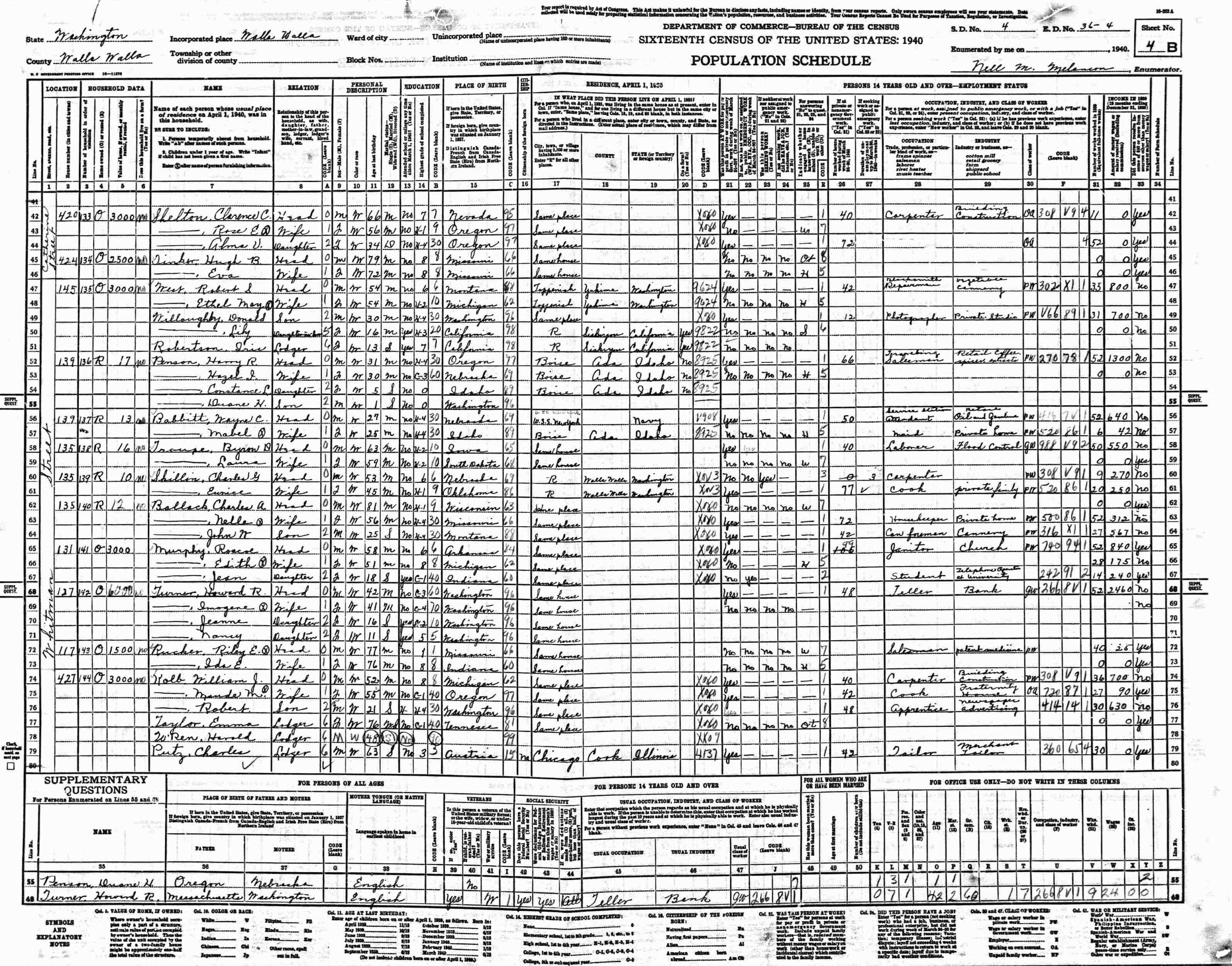 1940 - 139 Whitman, Supervisor's District 4, Enumeration District 36-4, Walla Walla, Walla Walla County, Washington.