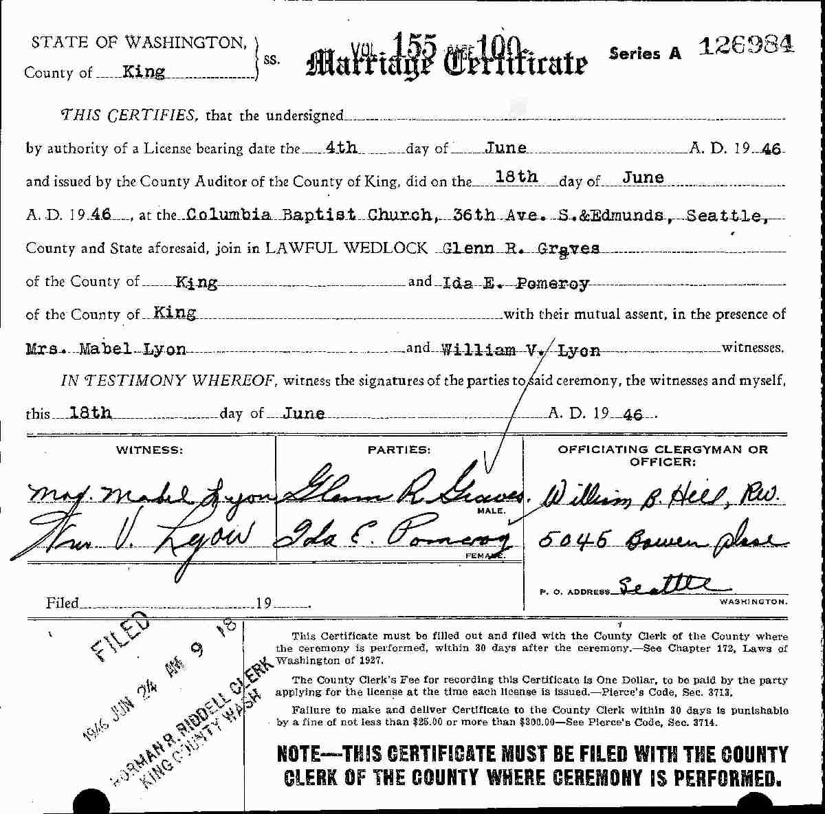 Married: Glenn Robinson Graves June 18, 1946 in Seattle, King County, Washington.