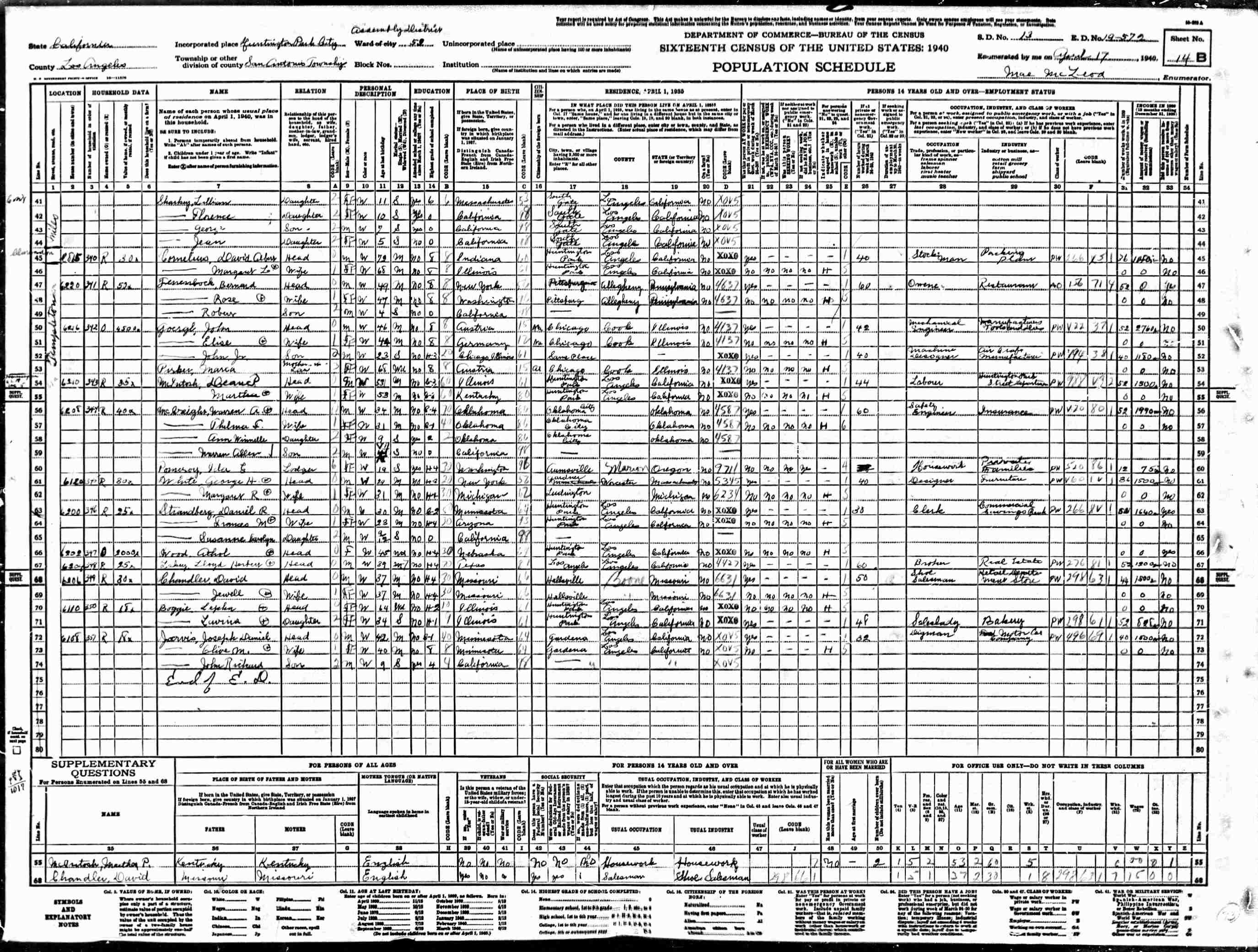 April 17, 1940 - 6208 Templeton, Assembly District 52, Supervisor's District 13, Enumeration District 19-572, San Antonio Township, Huntington Park City, Los Angeles County, California (Lodger).