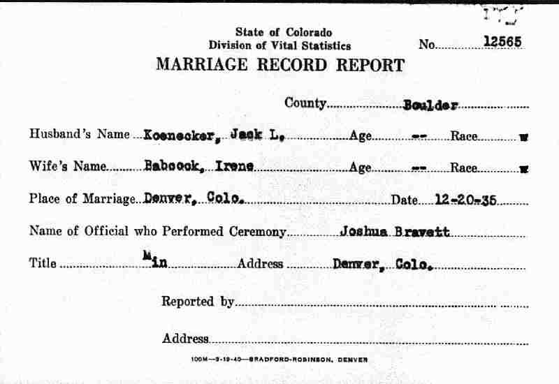 Married: Jack Louis Koennecker December 20, 1935 in Denver, Boulder County, Colorado.