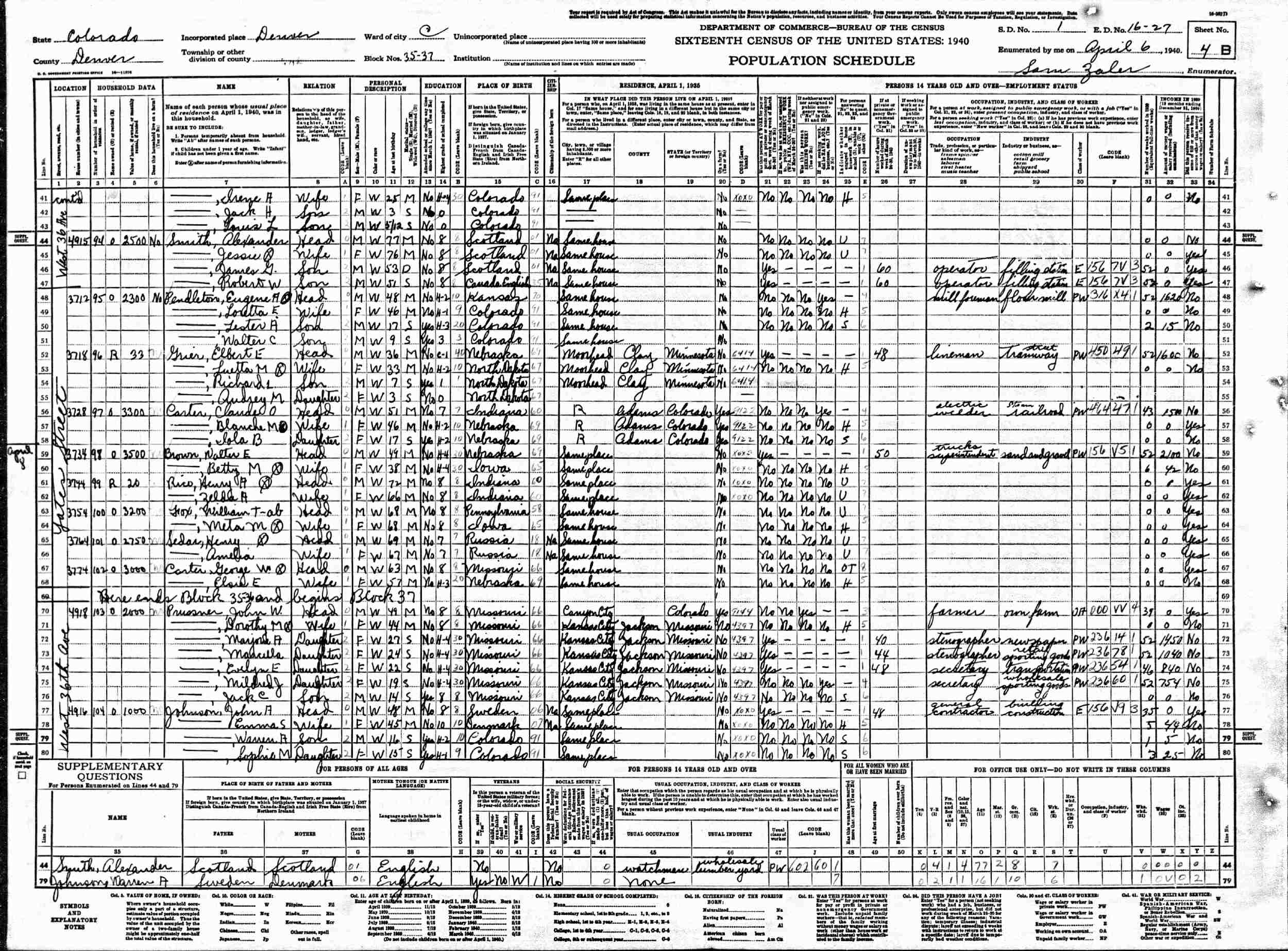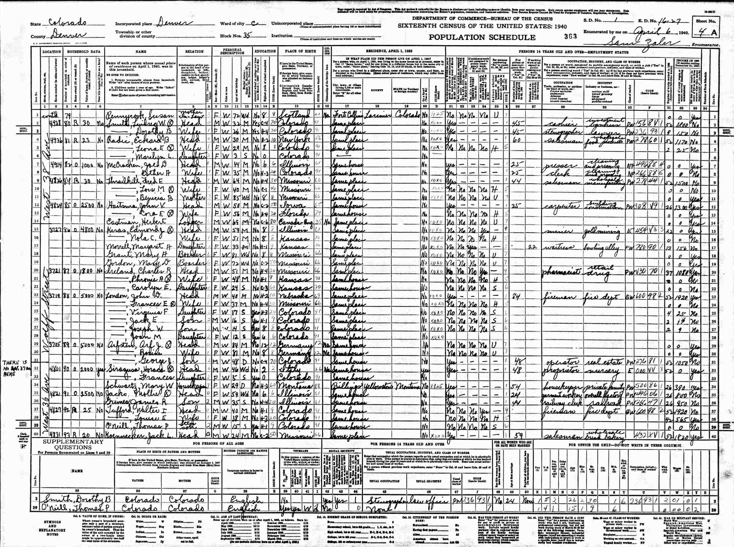 April 6, 1940 - 4831 West 37th Avenue, Ward 3, Block 35, Supervisor's District 1, Enumeration District 16-27, Denver, Denver County, Colorado.