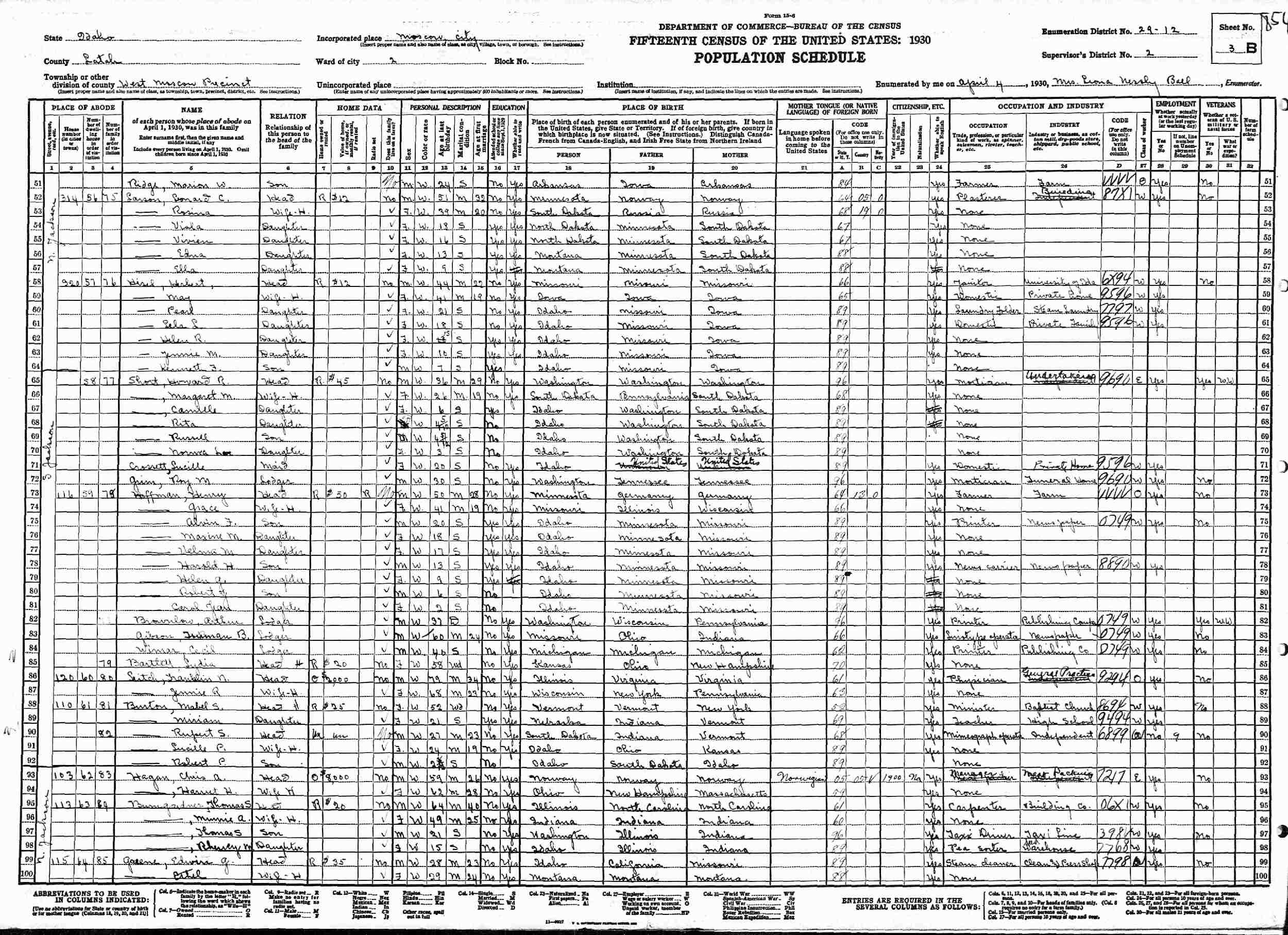 1910 - Supervisor's District 46, Enumeration District 196, South West Moscow Precinct, Latah County, Idaho.
