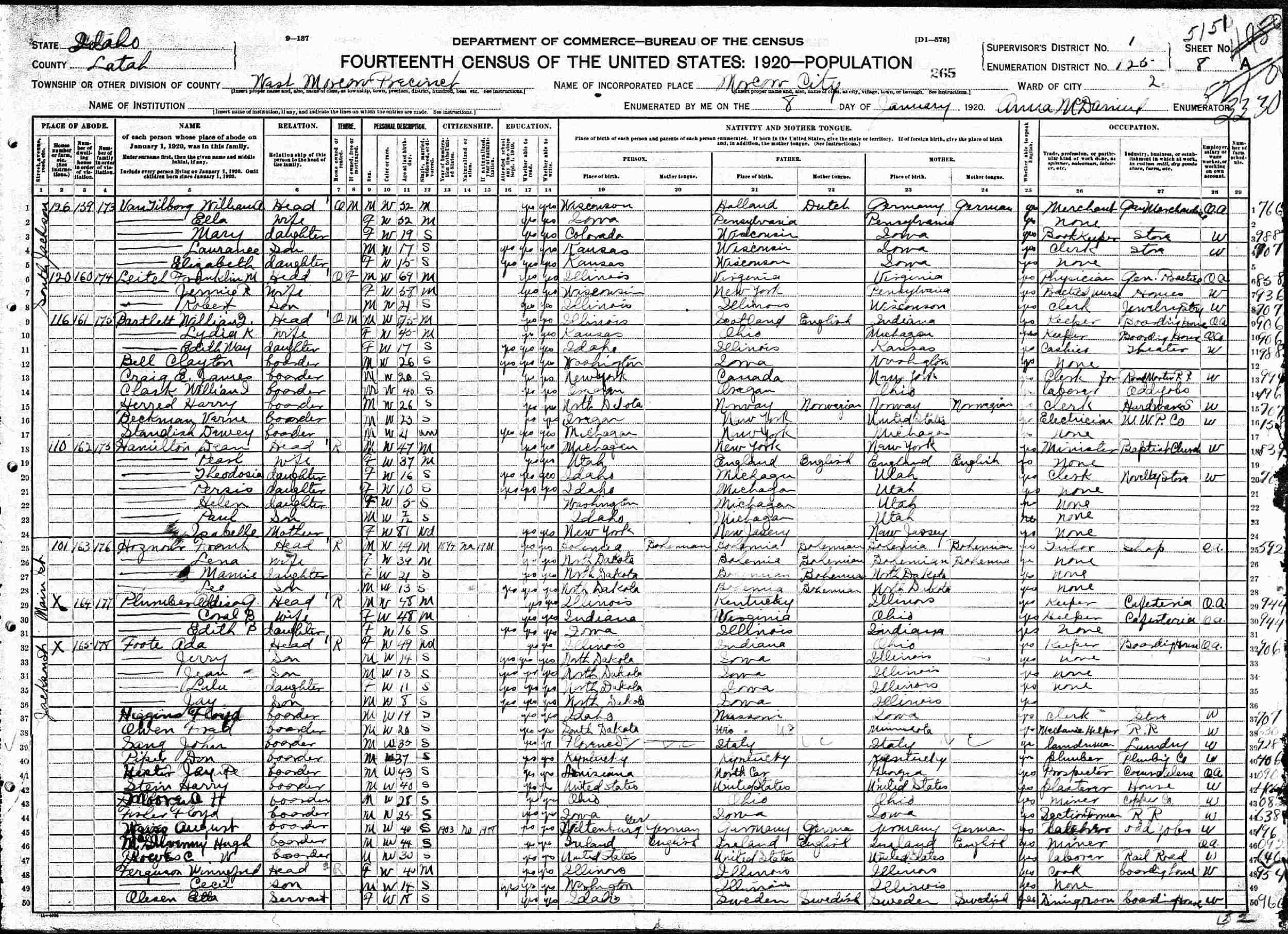 January 8, 1920 - 120 S. Jackson, Moscow City, West Moscow Precint, Ward 2, Supervisor's District 1, Enumeration District 125, Latah County, Idaho.