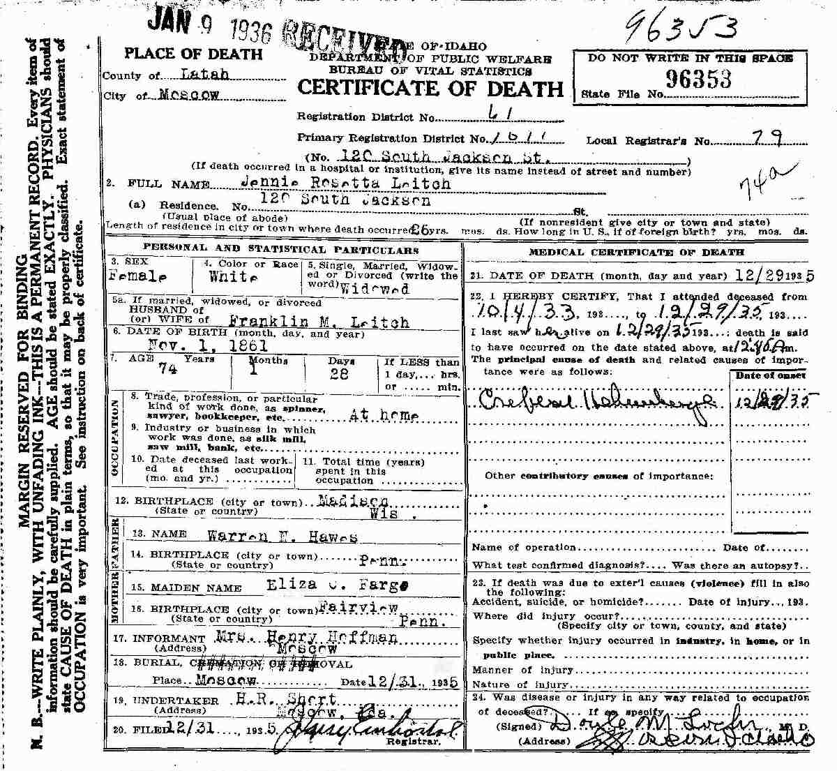 Died: December 29, 1935 in Moscow, Latah County, Idaho. (Death Certificate: #096353.)