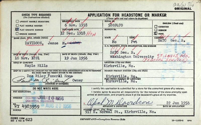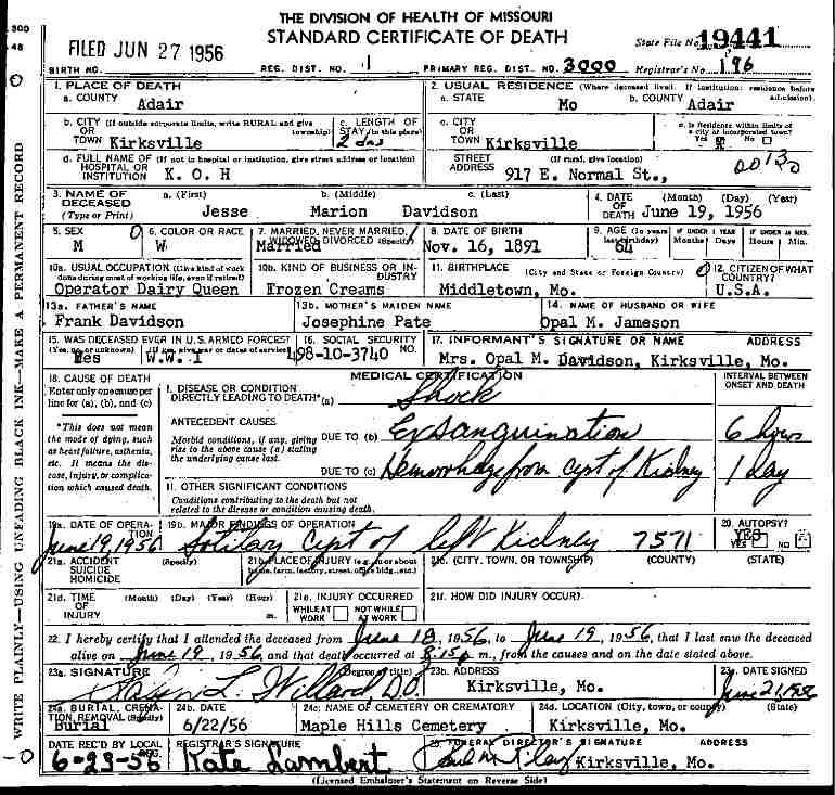 Died: June 19, 1956 in Kirksville, Adair County, Missouri.