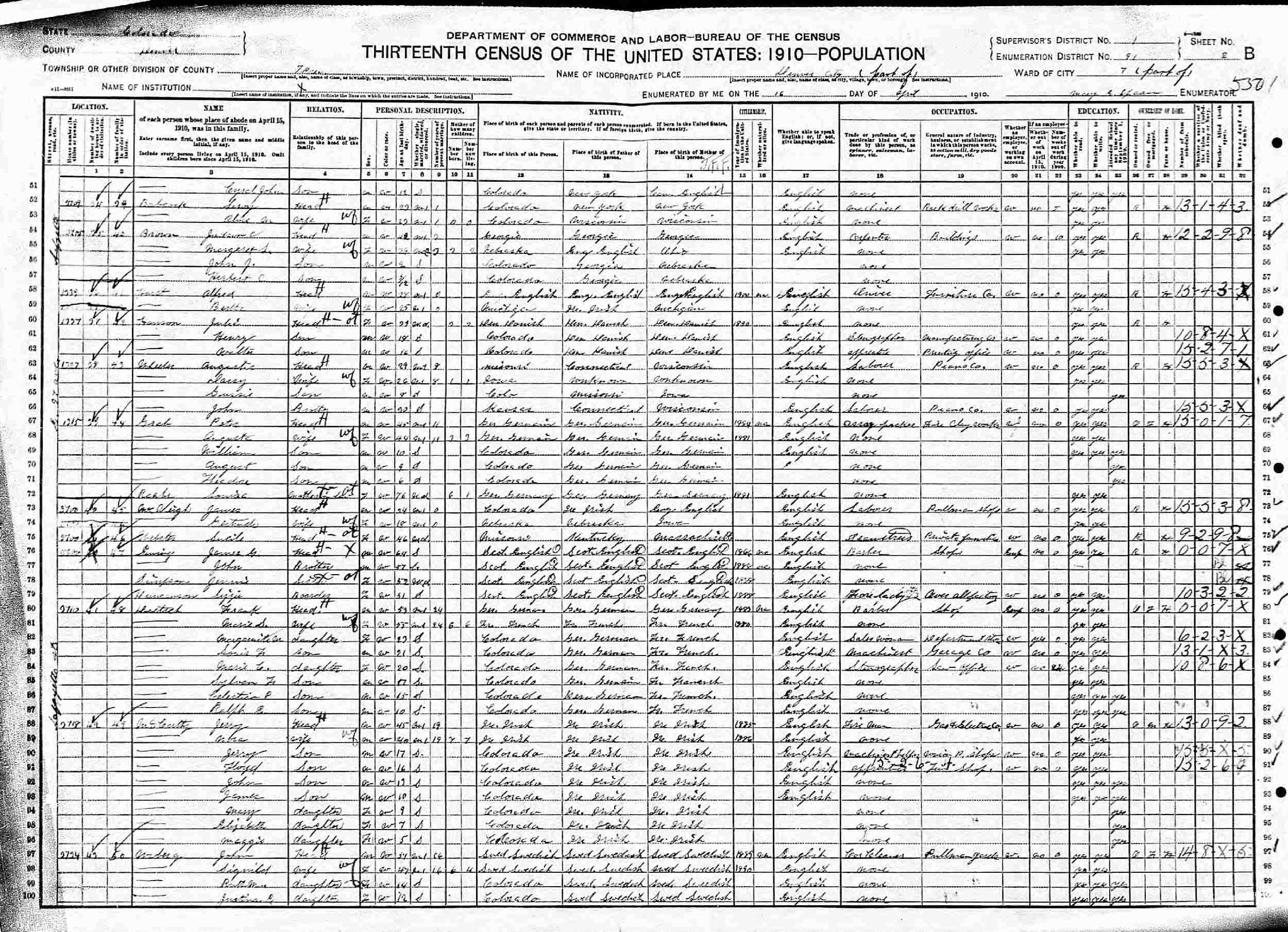April 16, 1910 - 2704 Lafayette Street, Ward 7, Supervisor's District 1, Enumeration Distric 91, Denver, Denver County, Colorado.