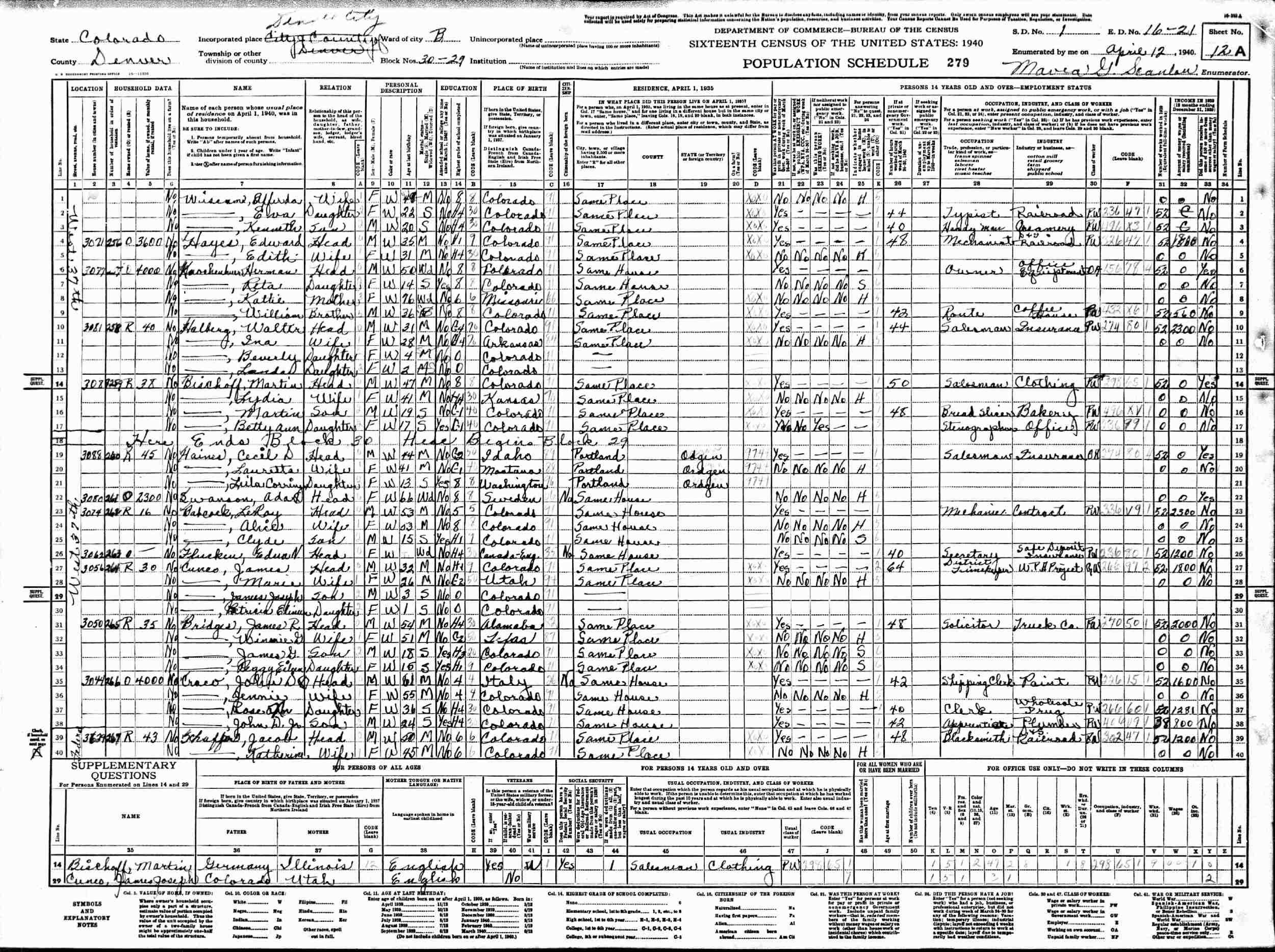 April 12, 1940 - 3074 West 37th Street, Ward B, Block 29-30, Supervisor's District 1, Enumeration District 16-21, Denver, Denver County, Colorado.