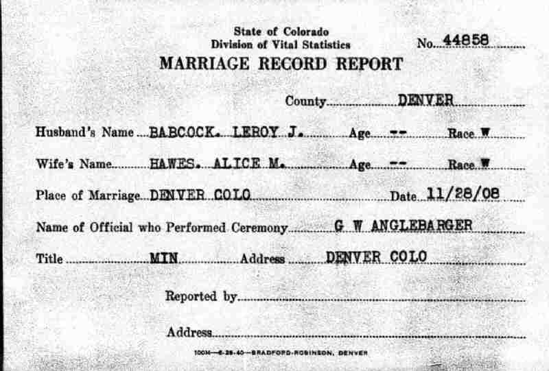 Married: Alice Malinda Hawes November 28, 1908 in Denver, Denver County, Colorado.