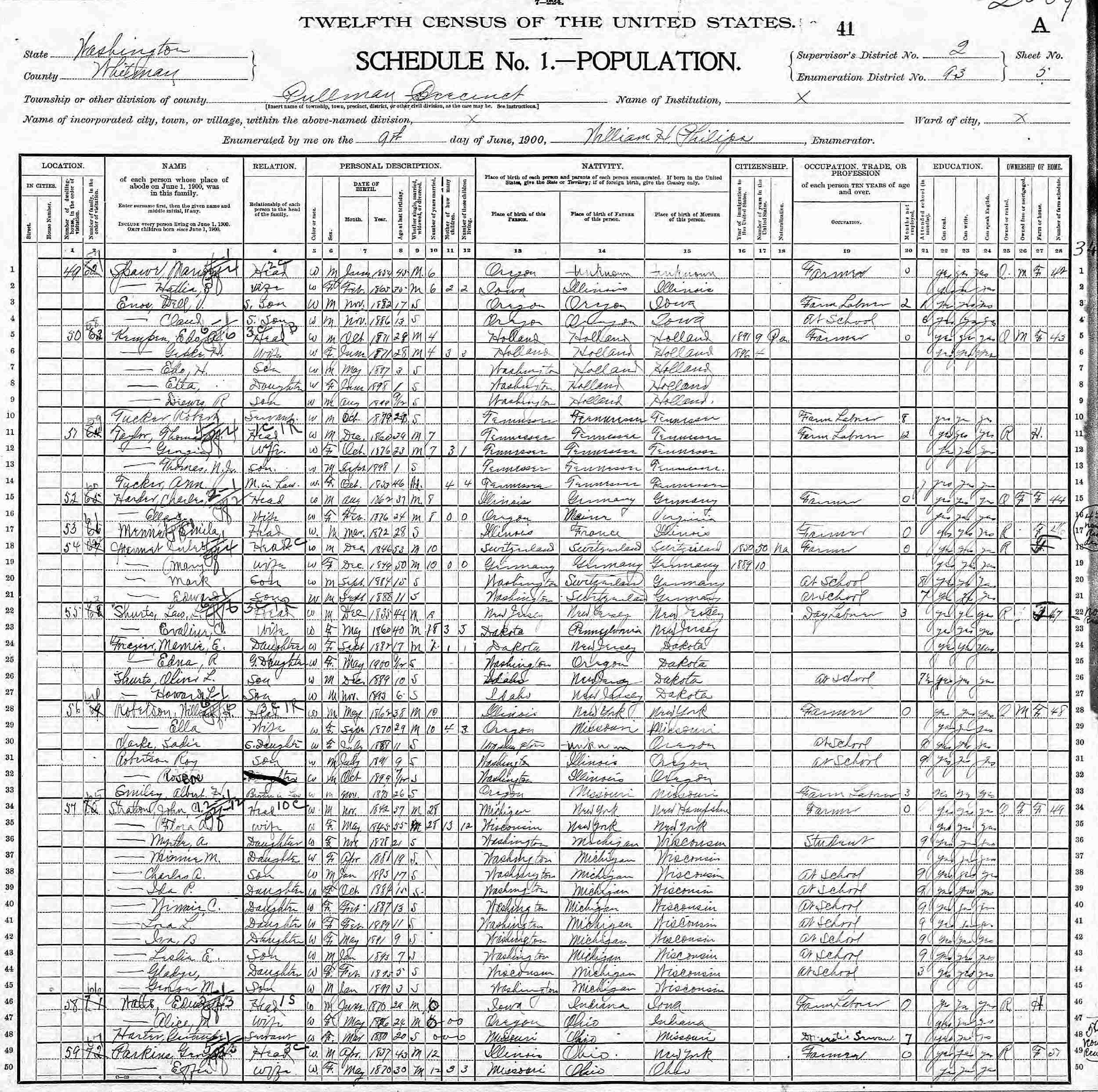 June 9, 1900 - Supervisor's District 2, Enumeration District 93, Pullman Precinct, Whitman County, Washington.