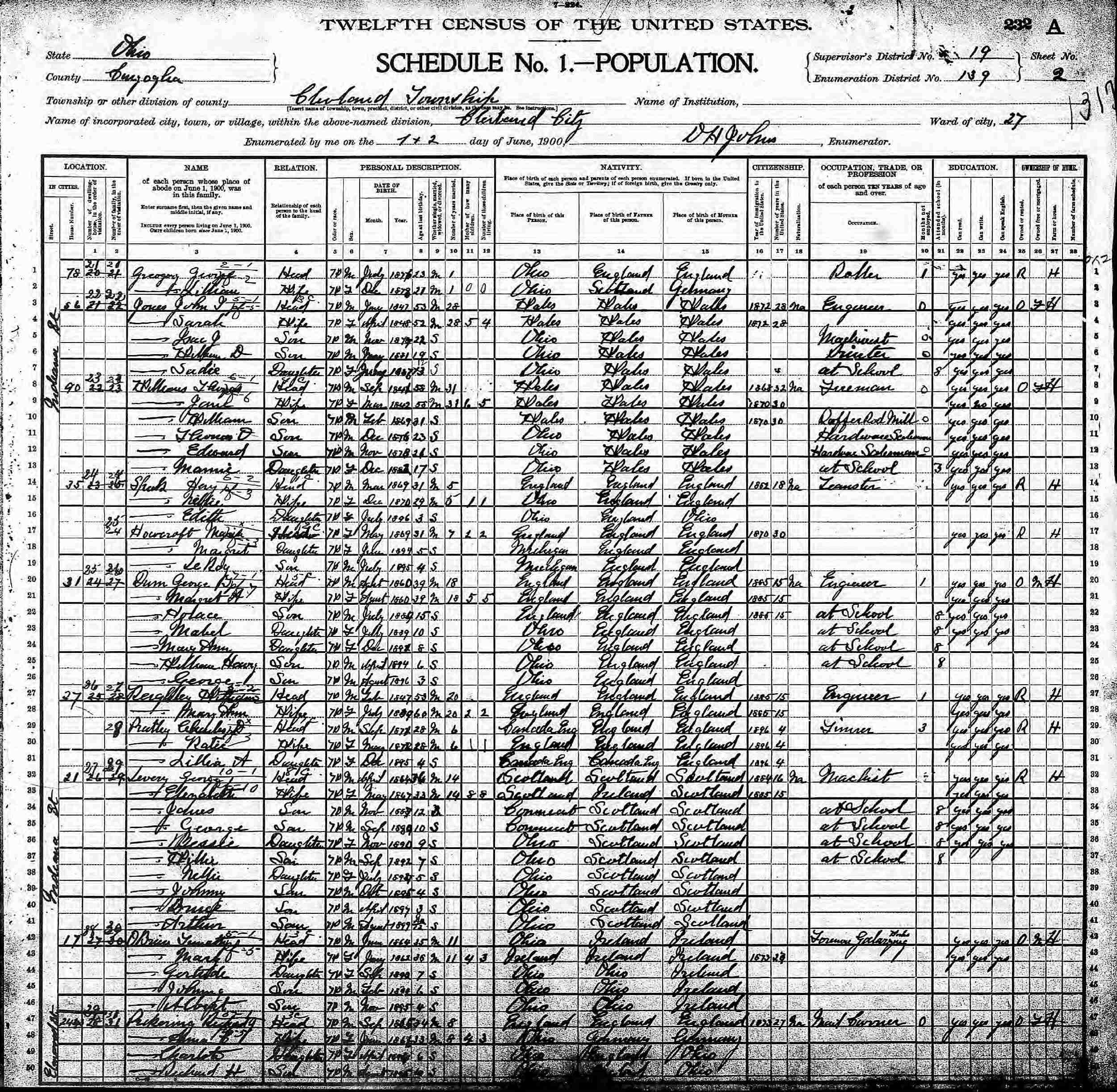 June 1-2, 1900 - 27 Indiana Street, Ward 27, Supervisor's District 19, Enumeration District 139, Cleveland, Cuyahoga County, Ohio.