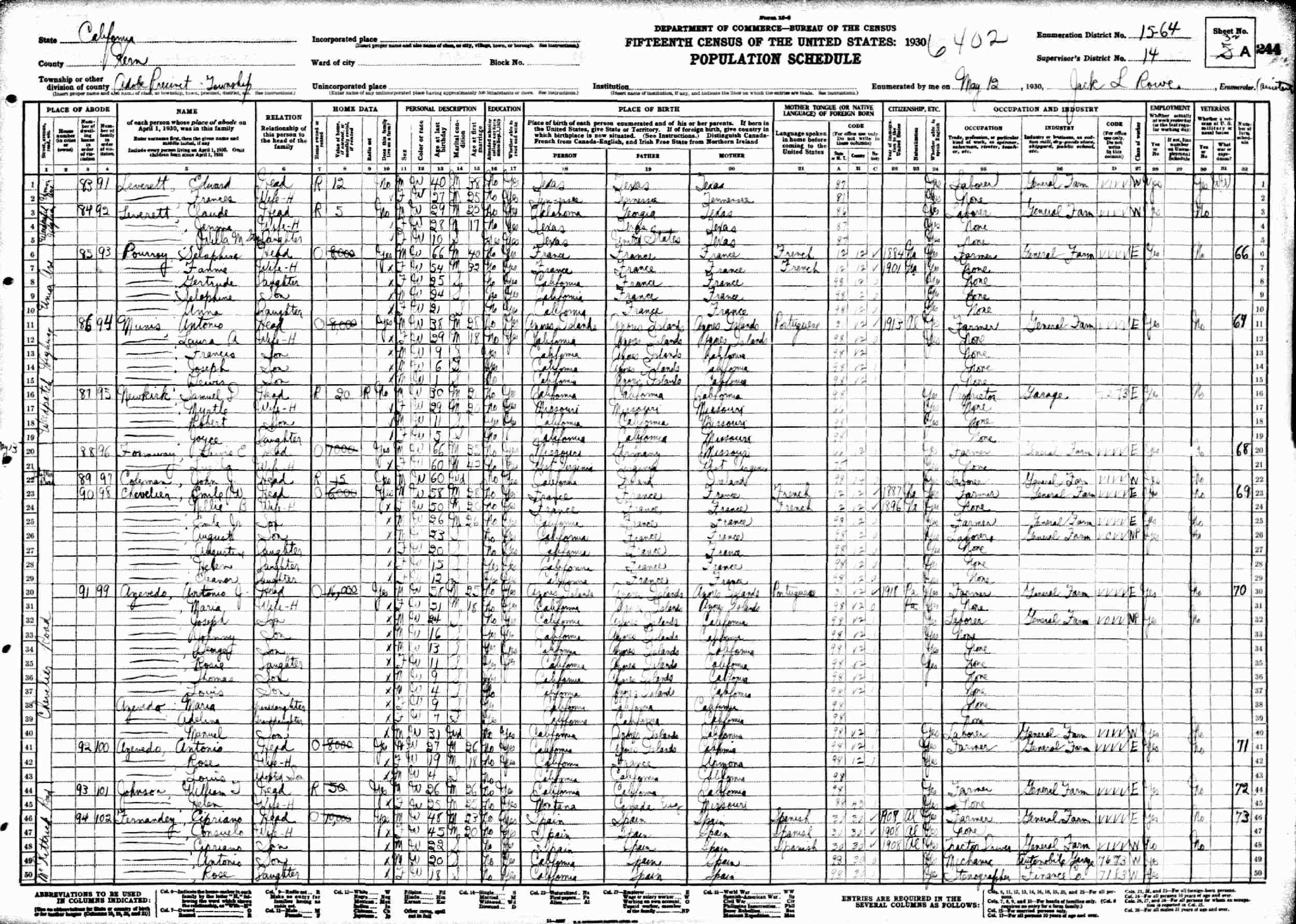 May 12, 1930 - Chavelier Road, Supervisor's District 14, Enumeration District 14-64, Adobe Township, Kern County, California.