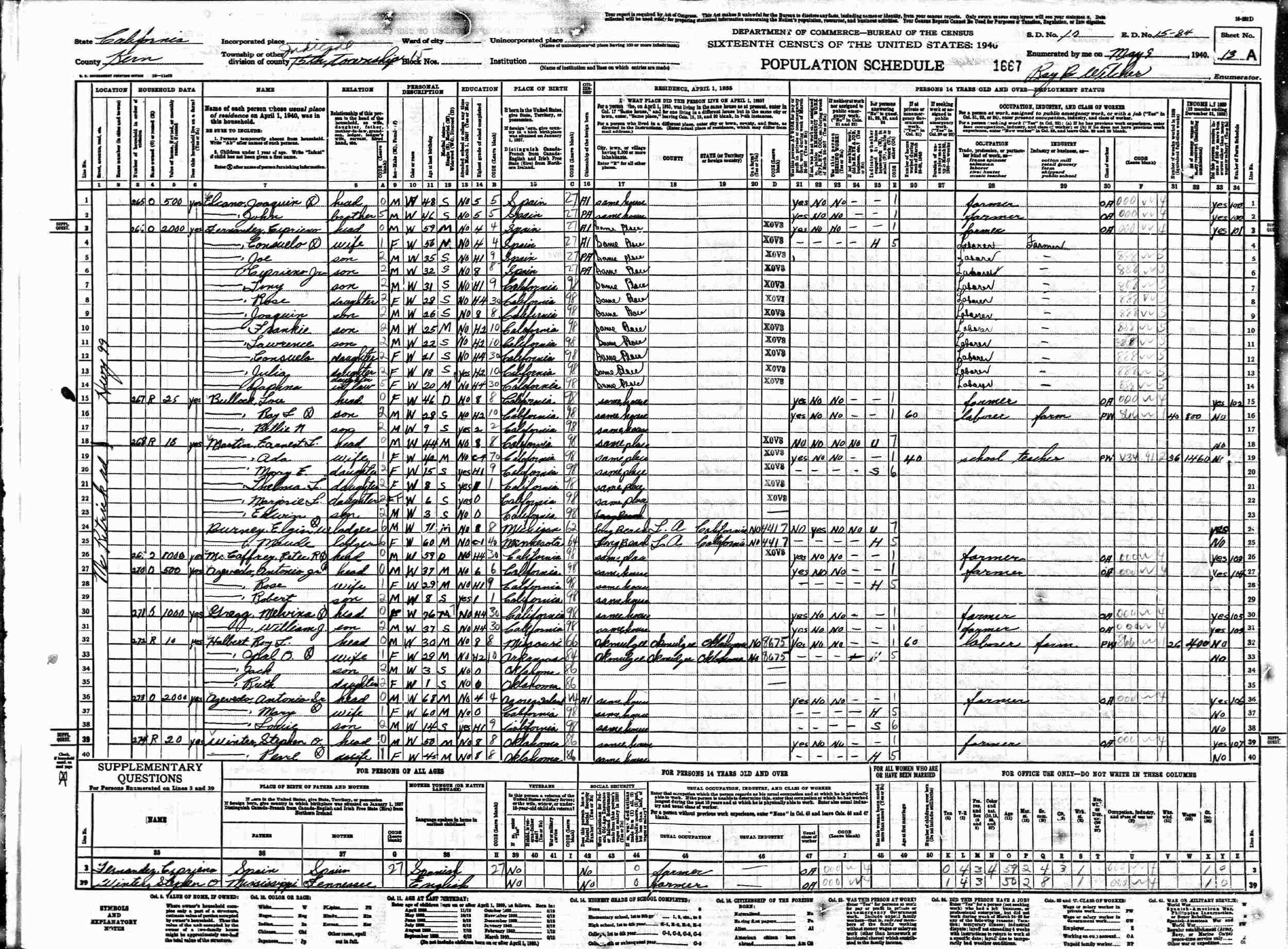 May 9, 1940 - McPatrick Road, Supervisor's District 10, Enumeration District 15-84, Judicial Township 15, Kern County, California.