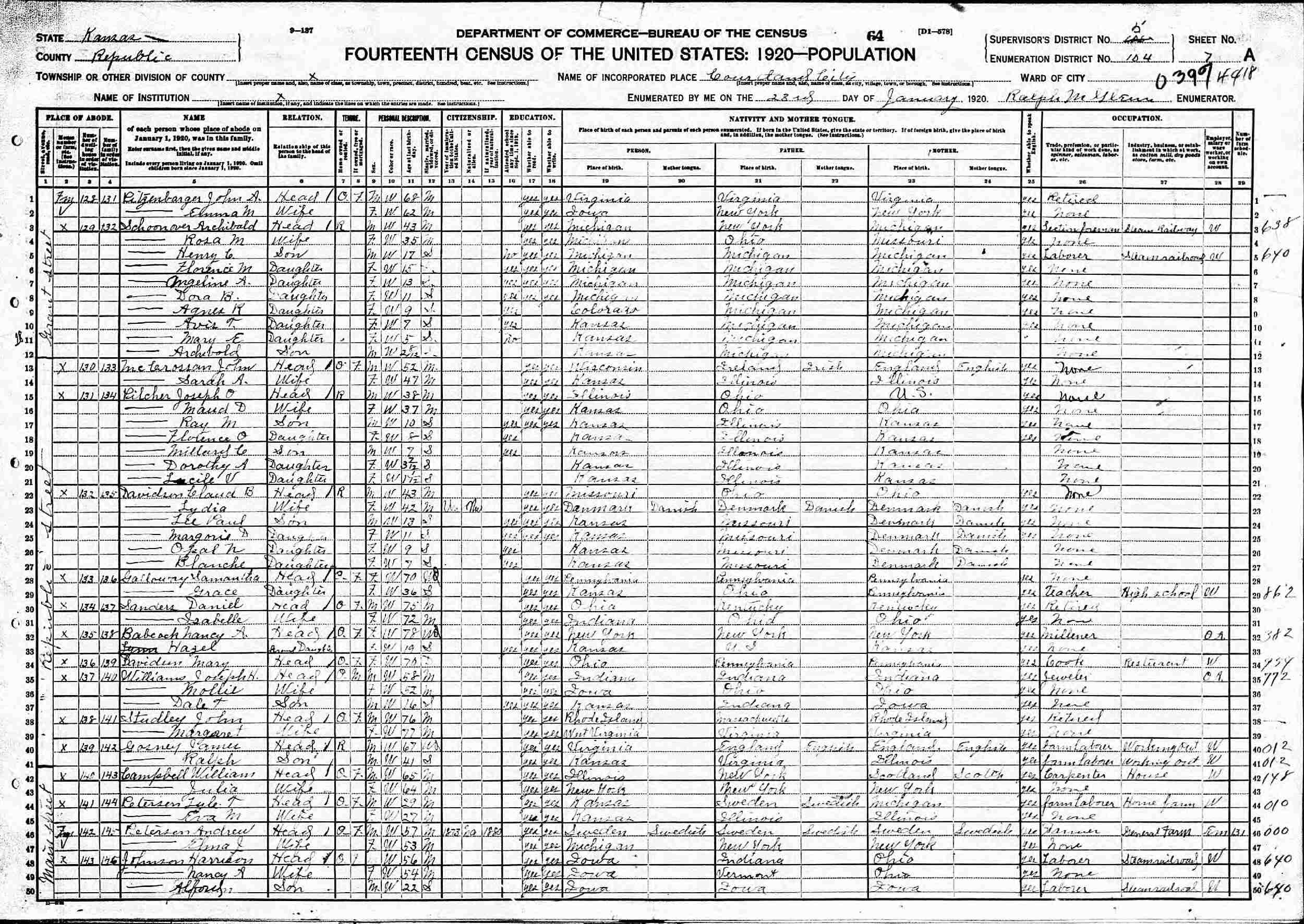 January 23, 1920 - Republic Street, Supervisor's District 5, Enumeration District 104, Courtland, Republic County, Kansas.