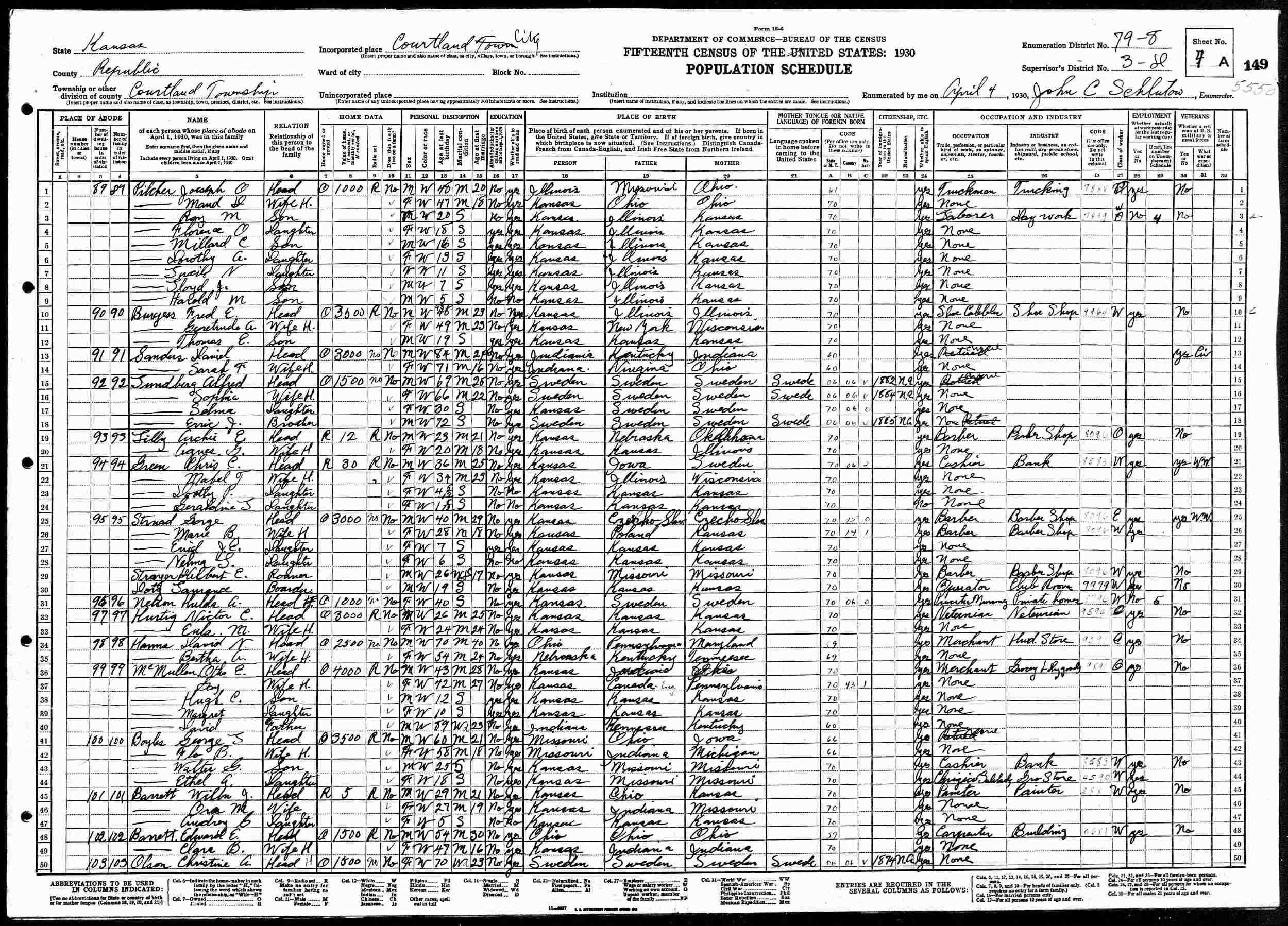 April 4, 1930 - Supervisor's District 3, Enumeration District 79-8, Courtland, Republic County, Kansas.