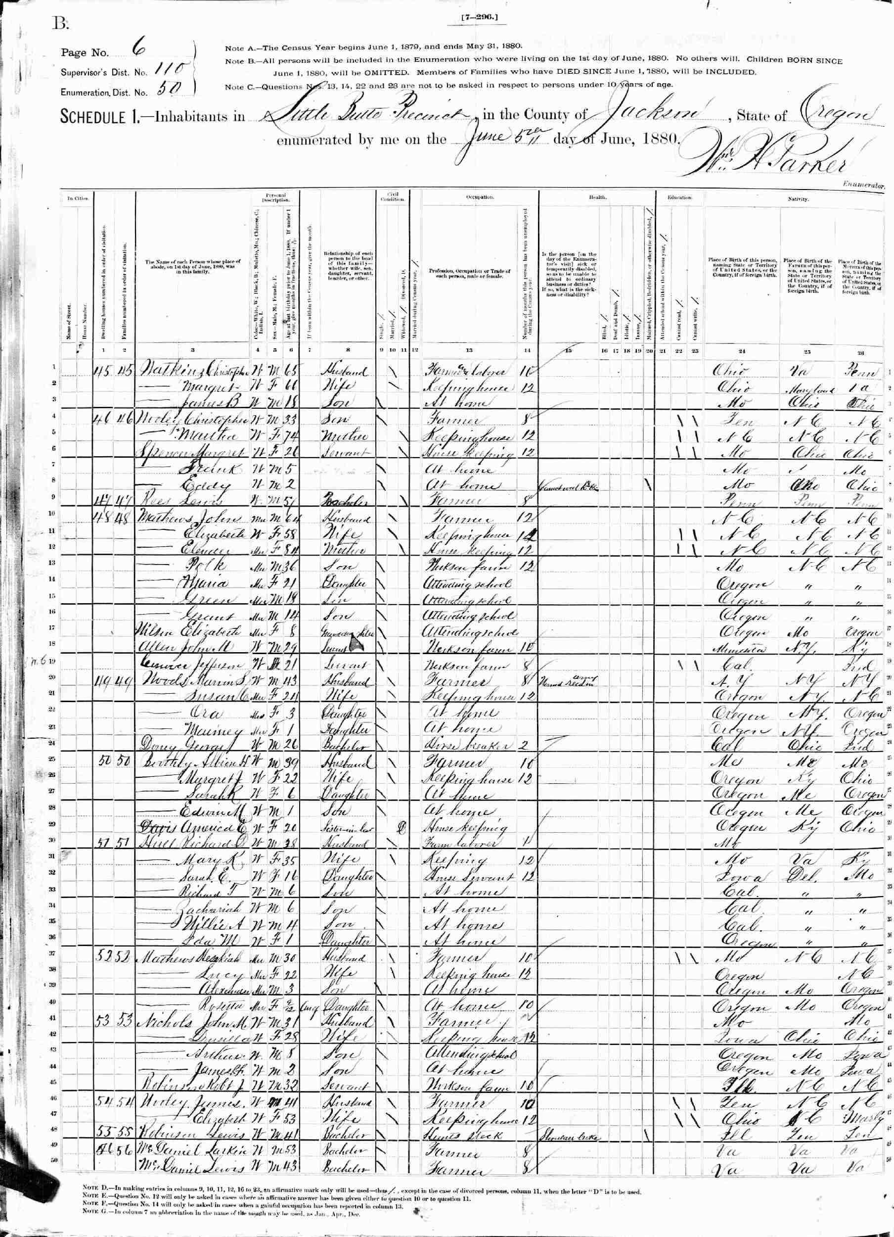 June 5, 1880 - Supervisor's District 110, Enumeration District 50, Little Butte Precinct, Jackson County, Oregon.
