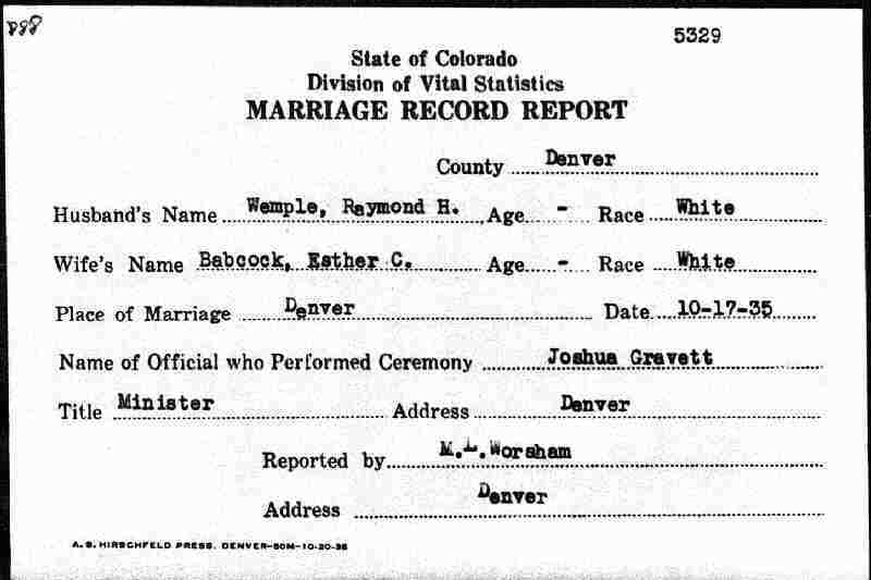 Married: Esther Charlotte Babcock October 17, 1935 in Denver, Denver County, Colorado.