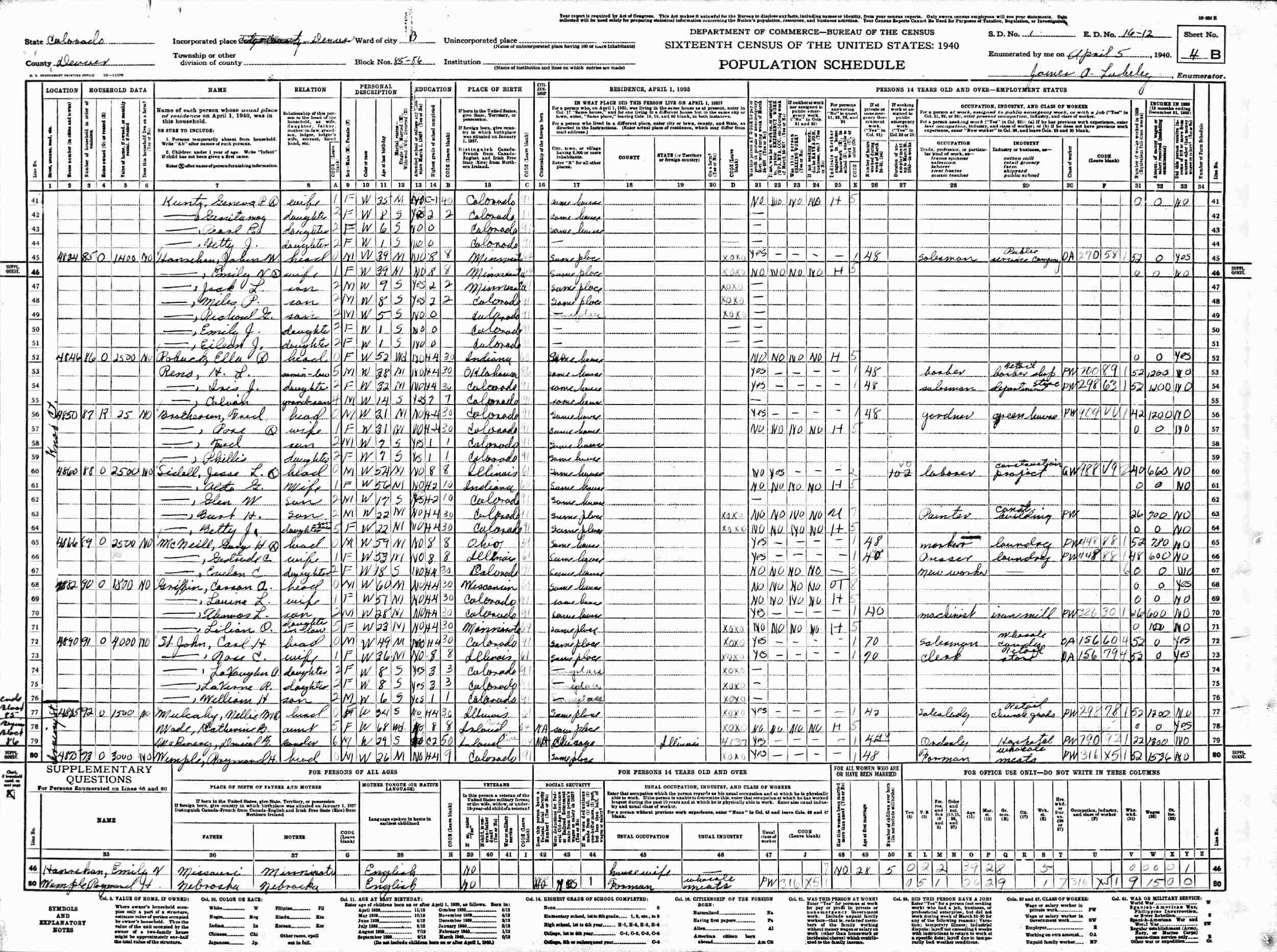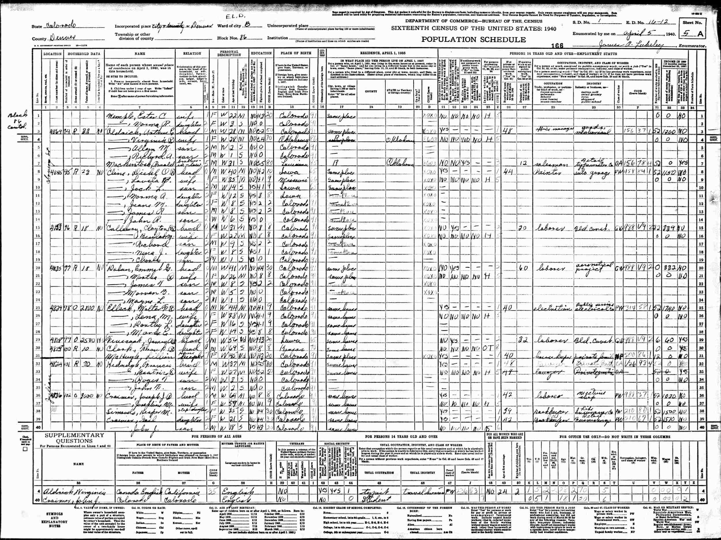 April 5, 1940 - 4869 Irwing Street, Ward B, Block 86, Supervisor's District 1, Enumeration District 16-12, Denver, Denver County, Colorado.