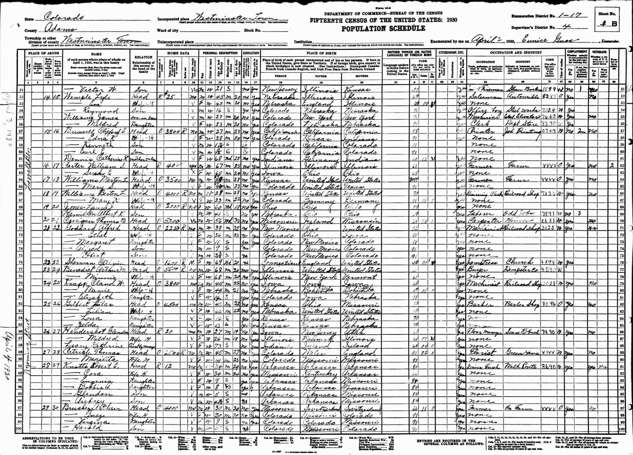 April 2, 1930 - Supervisor's District 4, Enumeration District 1-17, Westminster Town, Adams County, Colorado.
