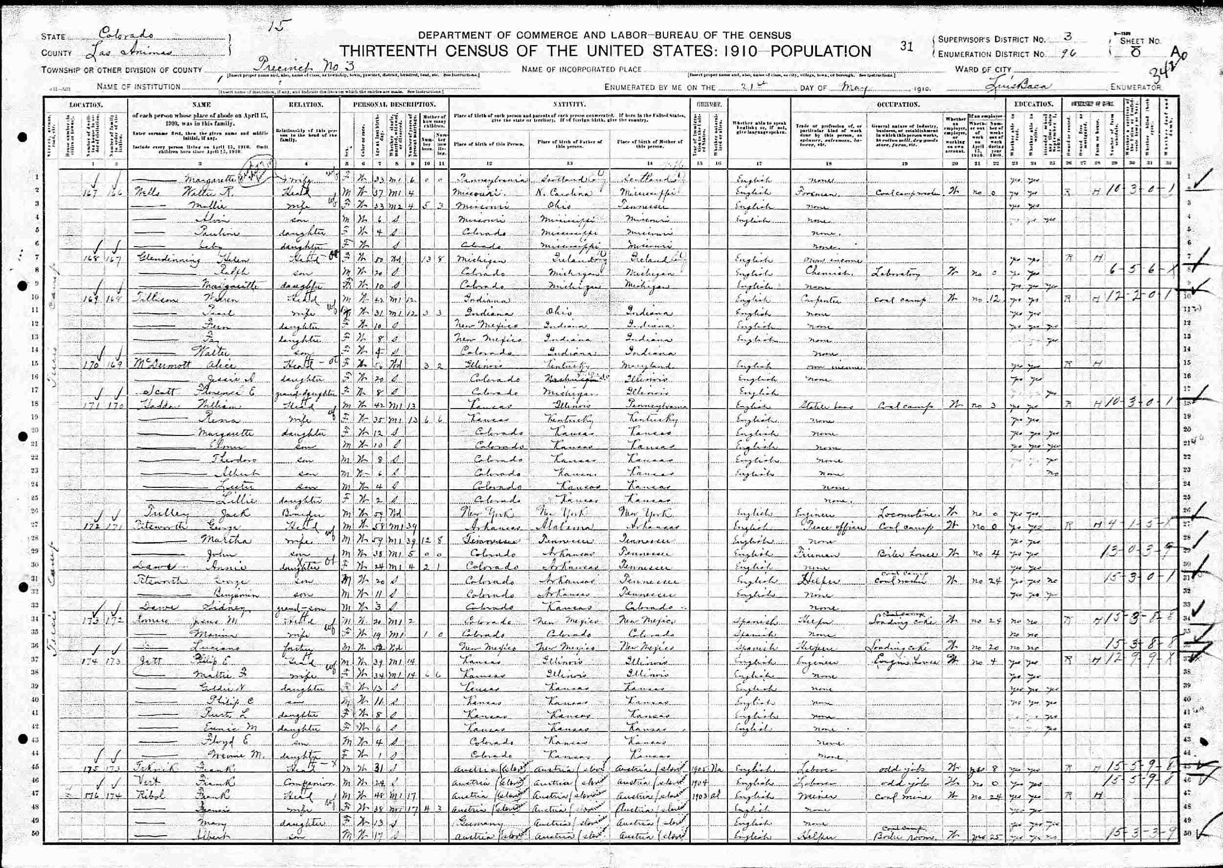 May 21, 1910 - Tuccio Camp, Precinct 3, Supervisor's District 3, Enumeration District 96, Las Animas County, Colorado (w/mother & maternl grandparents).