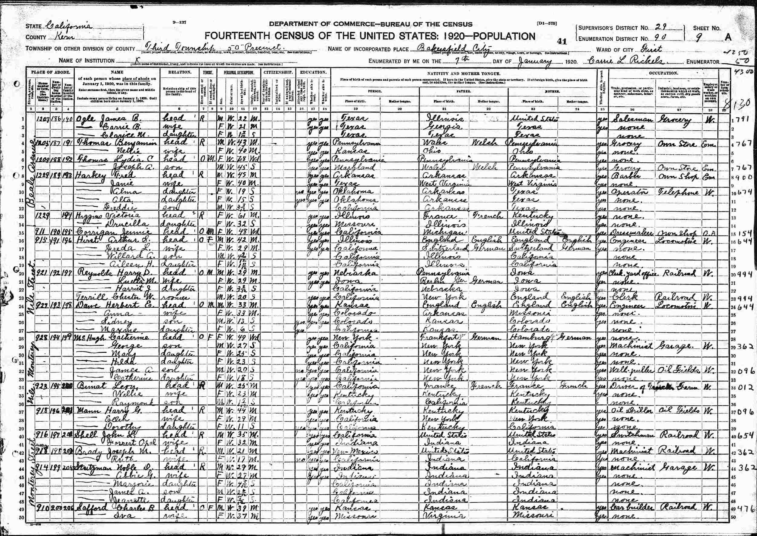 January 7, 1920 - 927 Nile Street, 50 Precinct, Ward 1, Supervisor's District 29, Enumeration District 90, Third Township, Bakersfield, Kern County, California.