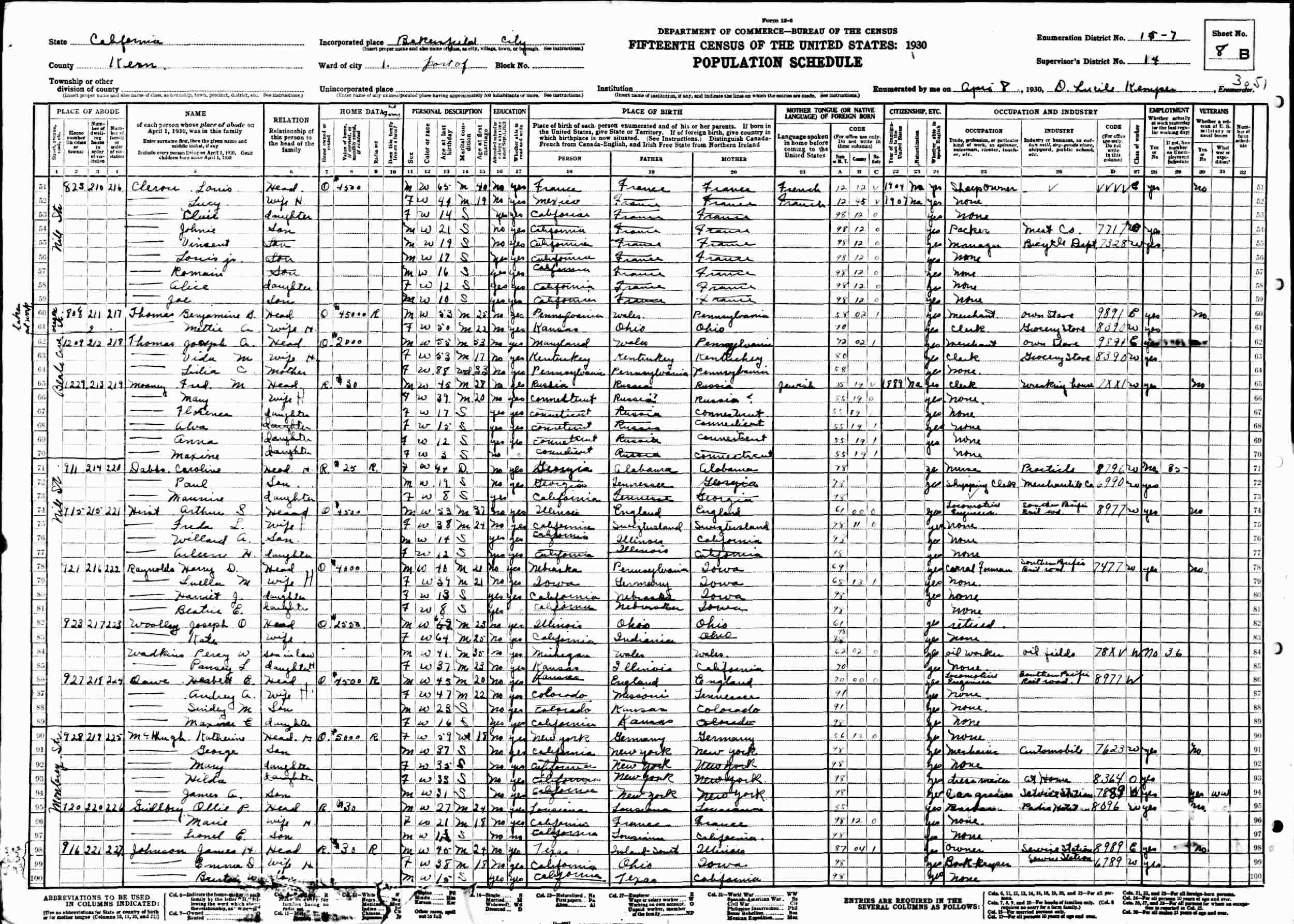 April 8, 1930 - 927 Nile Street, Ward 1, Supervisor's District 14, Enumeration District 15-7, Bakersfield, Kern County, California.