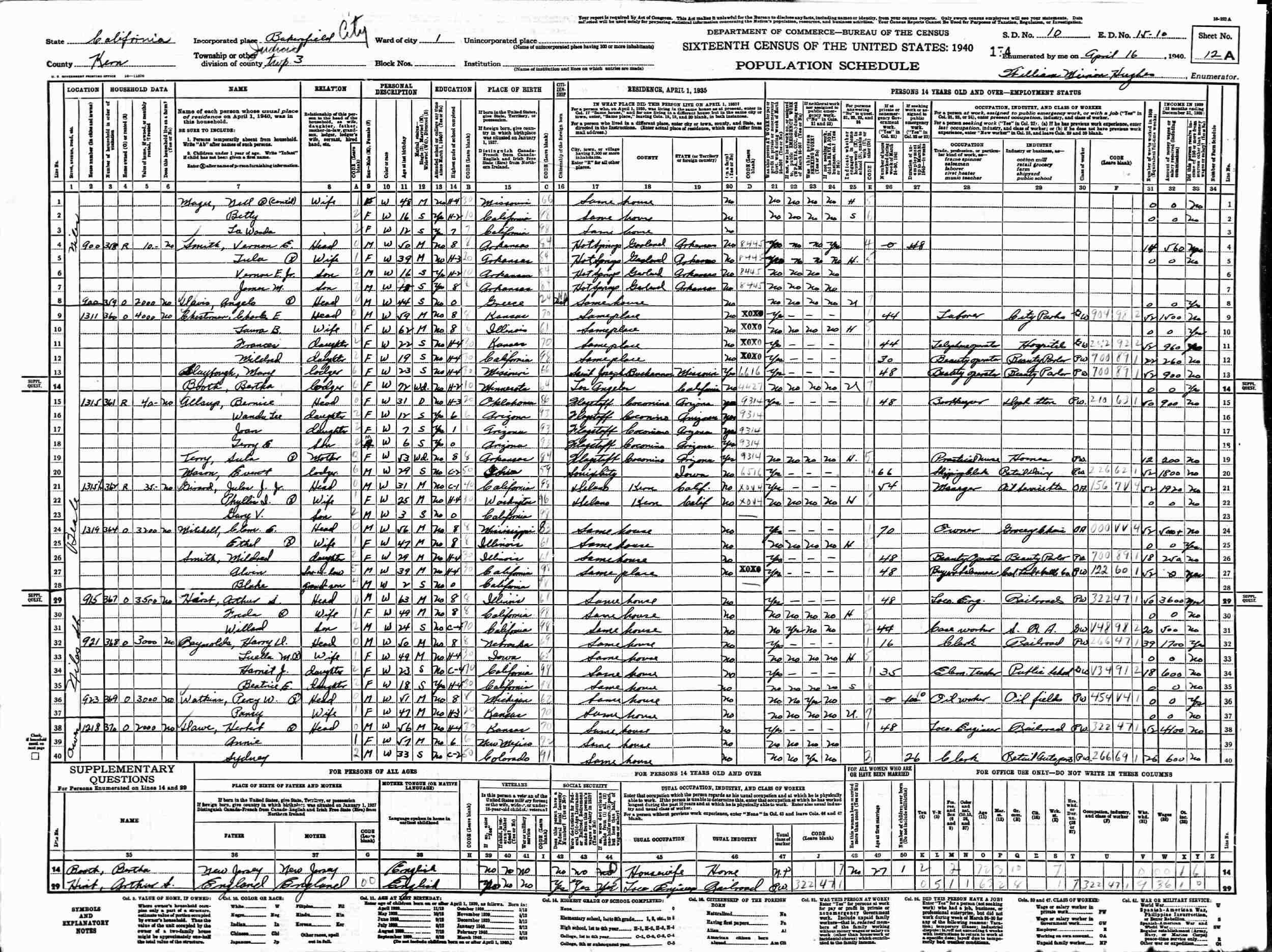 April 16, 1940 - 1218 Owens Street, Judicial Township 3, Supervisor's District 10, Enumeration District 15-10, Bakersfield, Kern County, California.