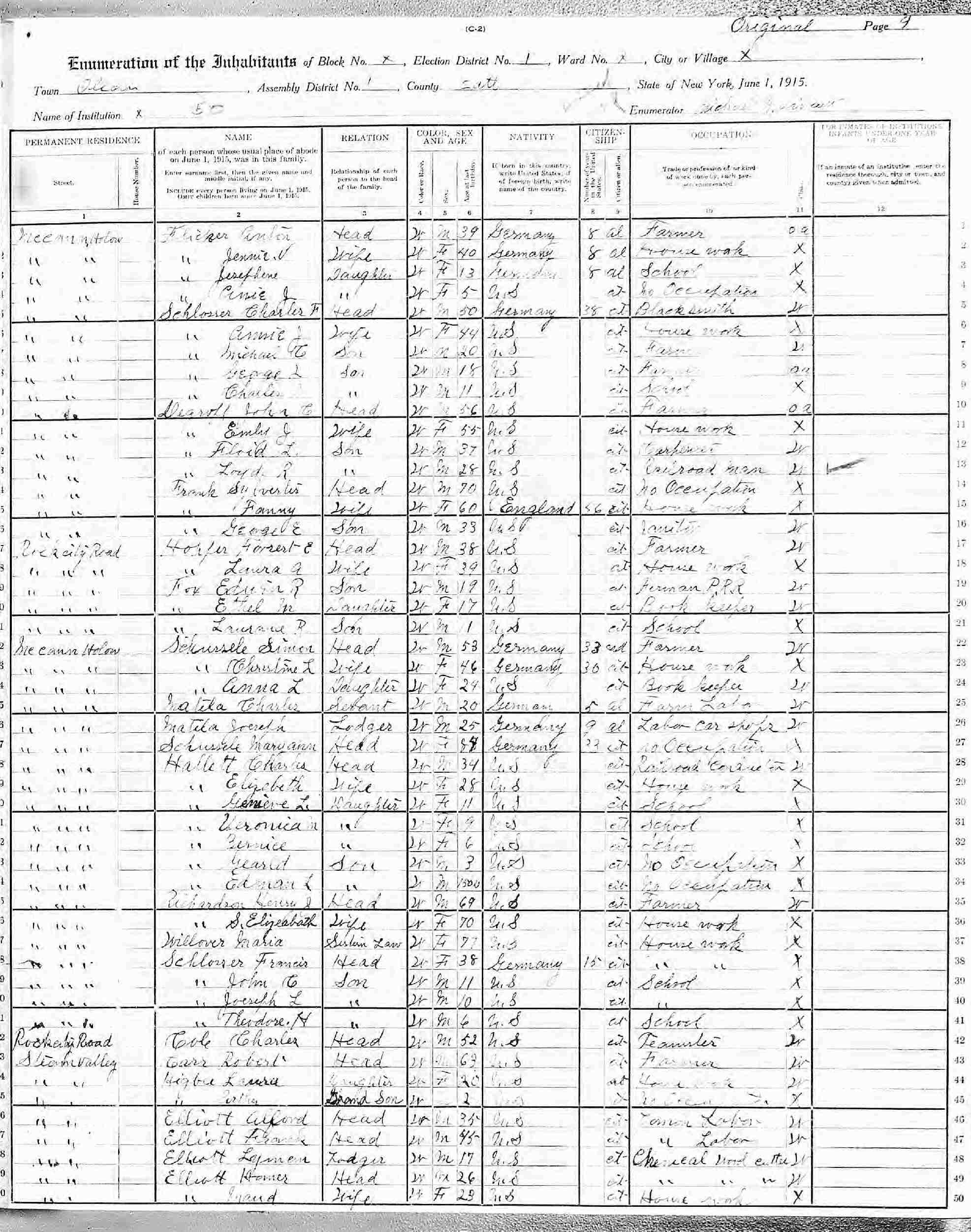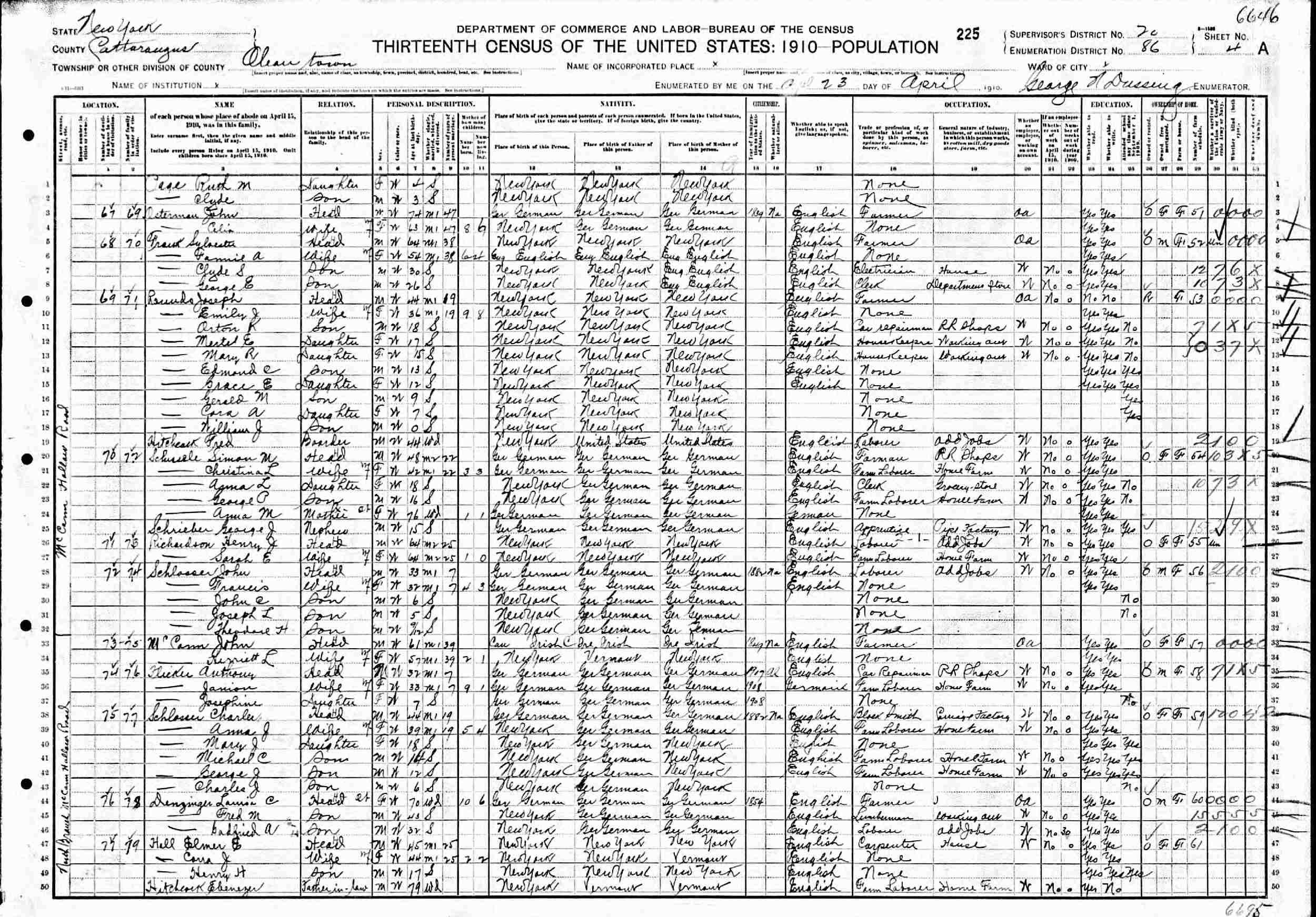 April 23, 1910 - North Branch McCaann Hollow Road, Supervisor's District 20, Enumeration District 86, Olean, Cattaraugus County, New York.