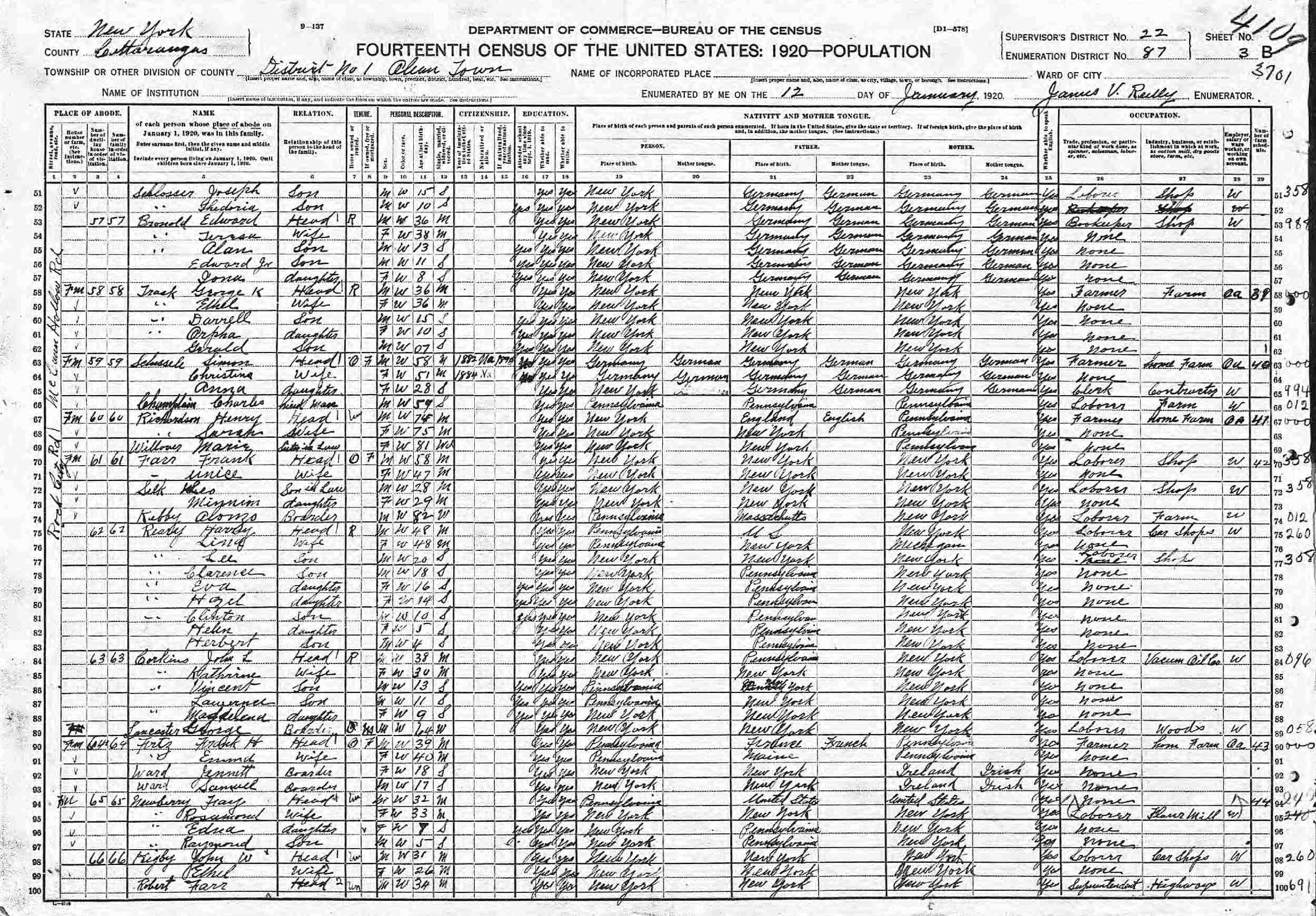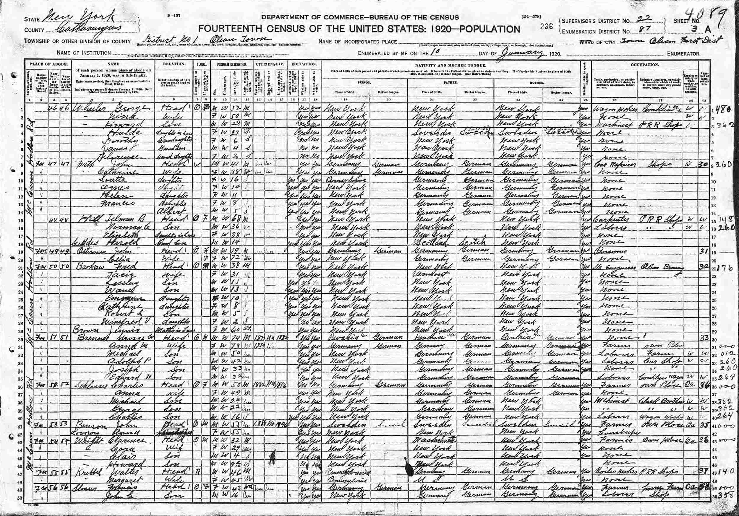 January 12, 1920 - McCann Hollow Road, District 1, Supervisor's District 22, Enumeration District 87, Olean, Cattaraugus County, New York.