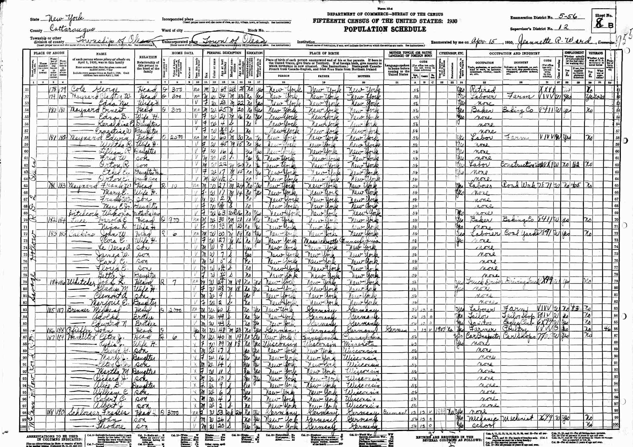April 15, 1930 - McCann Hollow Road, (R.D. 2), Supervisor's District 12, Enumeration District 5-56, Olean, Cattaraugus County, New York.