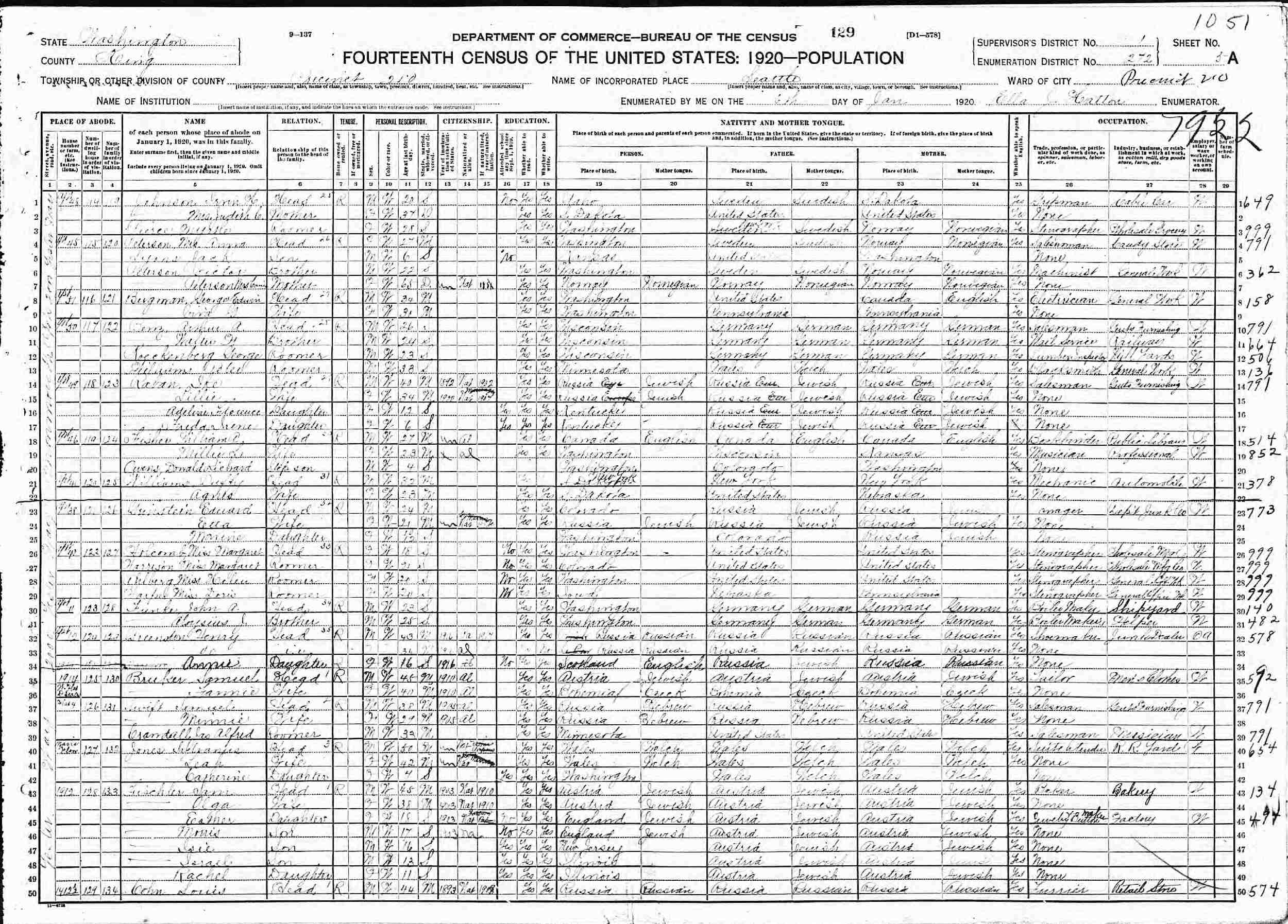 January 6, 1920 - Monmouth Apt 2000 Yesler Way #51, Precinct 210, Supervisor's District 1, Enumeration District 272, Seattle, Kings County, Washington.