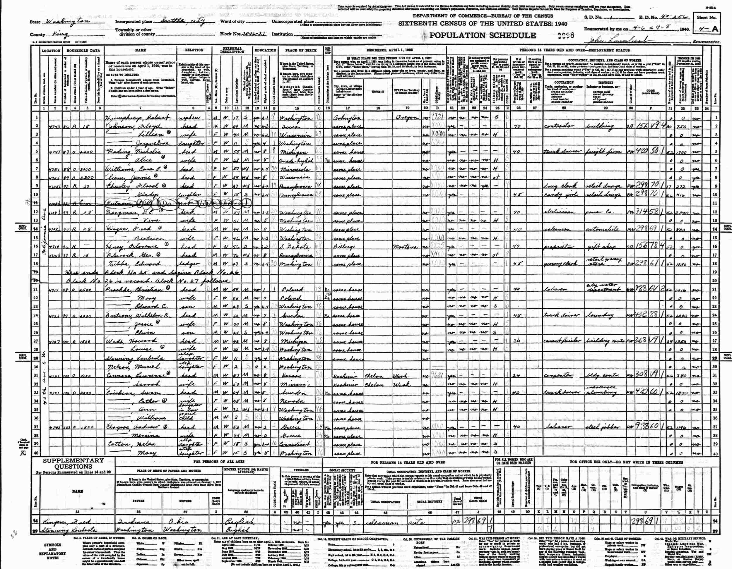 April 6-8, 1940 - 4708 1/2 California Avenue, Blocks 25-27, Supervisor's District 1, Emumeration District 40-246,Seattle, King County, Washington.