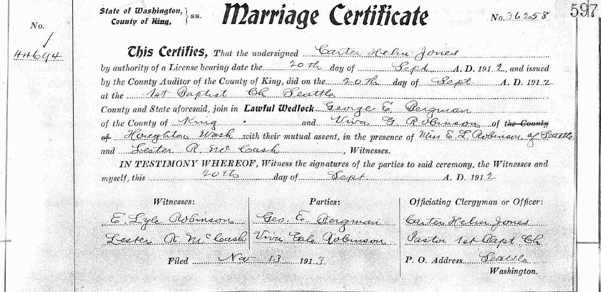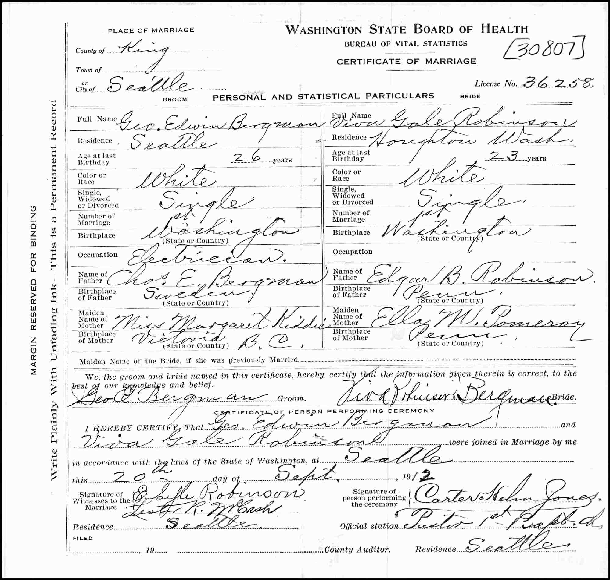 Married: George Edwin Bergman September 20, 12 in Seattle, King County, Washington.
