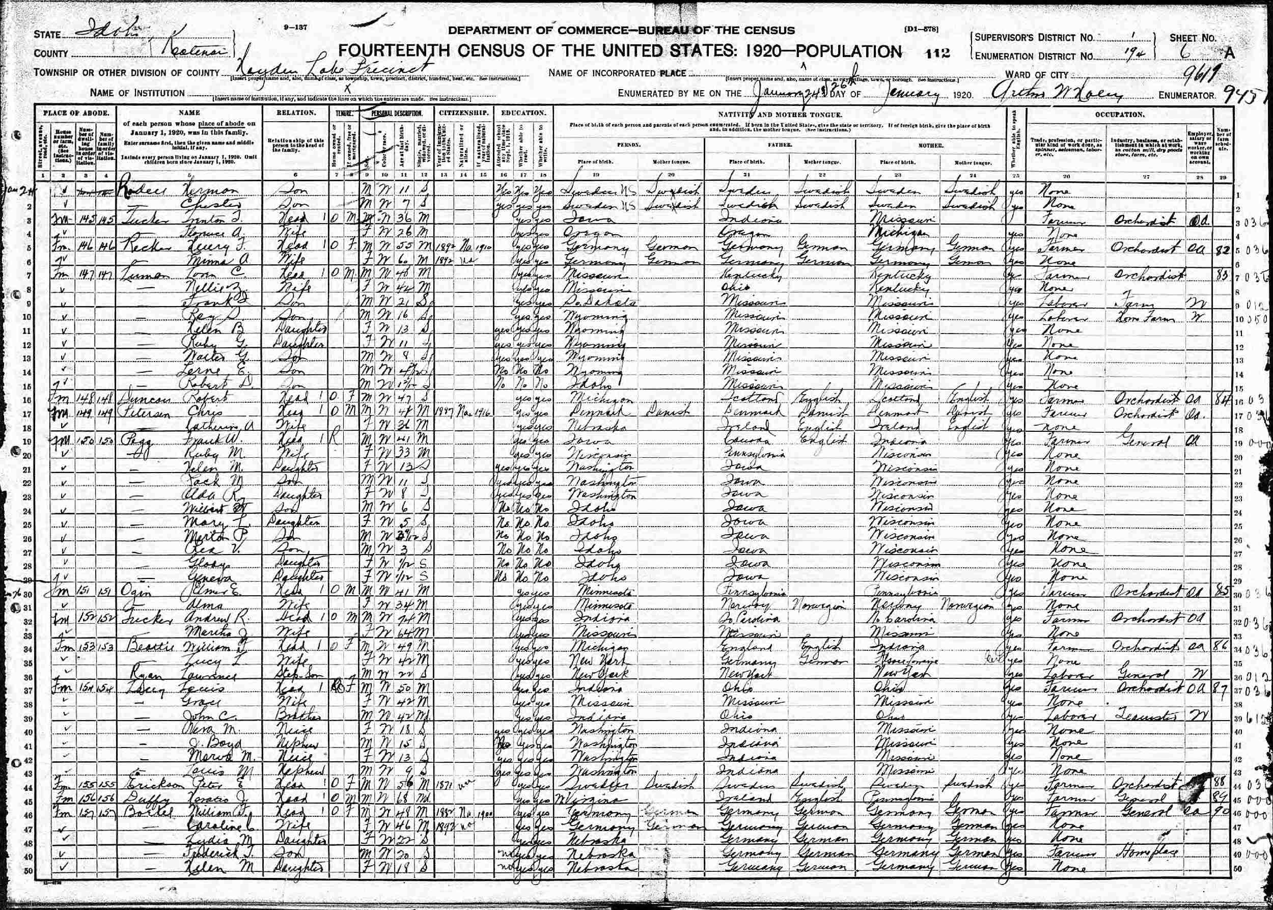 January 24-26, 1920 - Supervisor's District 1, Enumeration District 194, Hayden Lake Precinct, Kootenai County, Idaho.