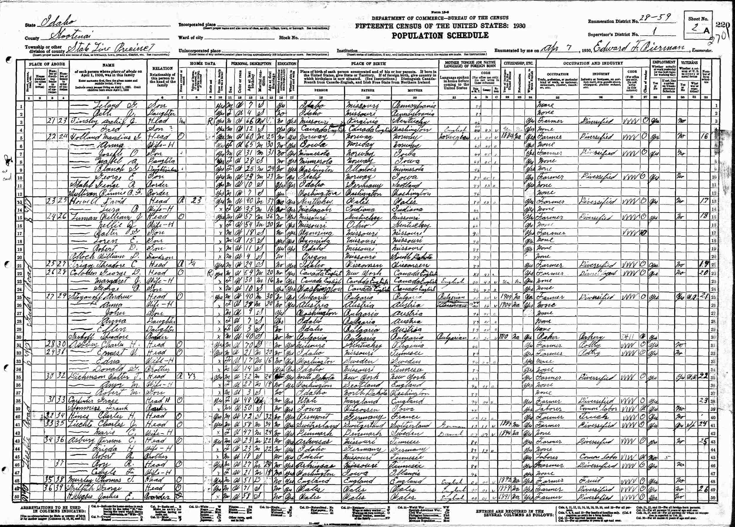 April 18, 1940 - Supervisor's District 1, Enumeration District 28-53, State Line Precinct, Kootenai County, Idaho.