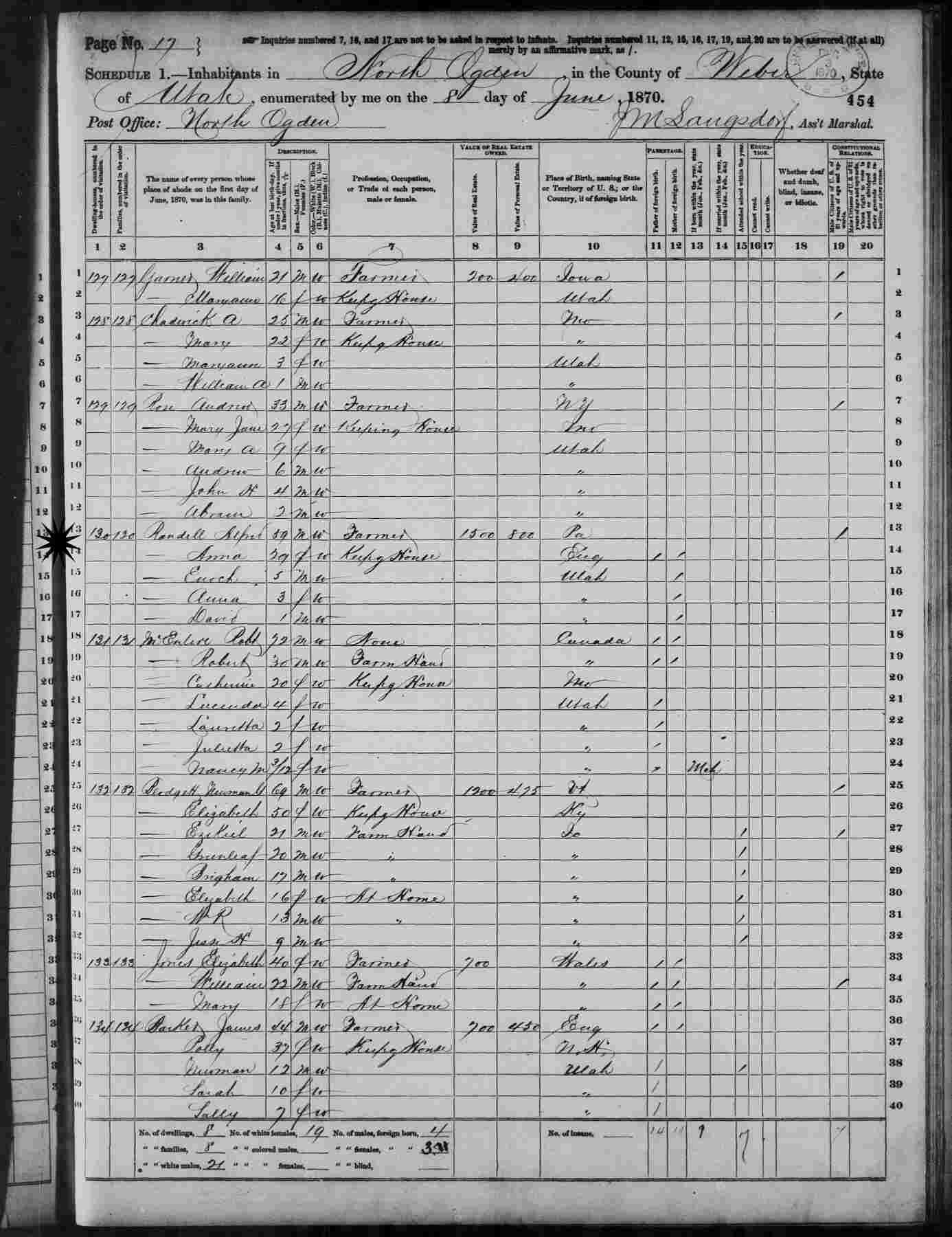 1870: North Ogden, Weber County, Utah - last name spelled as Randell.