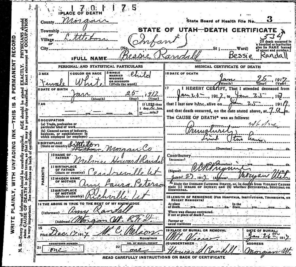 Notes for BESSIE RANDALL: Daughter of Melvin Howard and Amy Laura (Peterson) Randall. Born: January 25, 1917 in Centerville, Davis County, Utah. Died: January 25, 1917 in Littleton, Morgan County, Utah. Buried: Morgan County, Utah.
