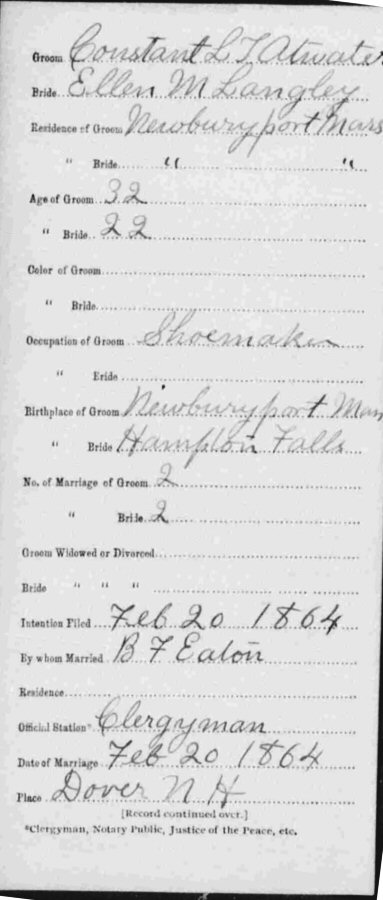 (2) Ellen M Langley February 20, 1864 in Dover, Strafford County, New Hampshire.