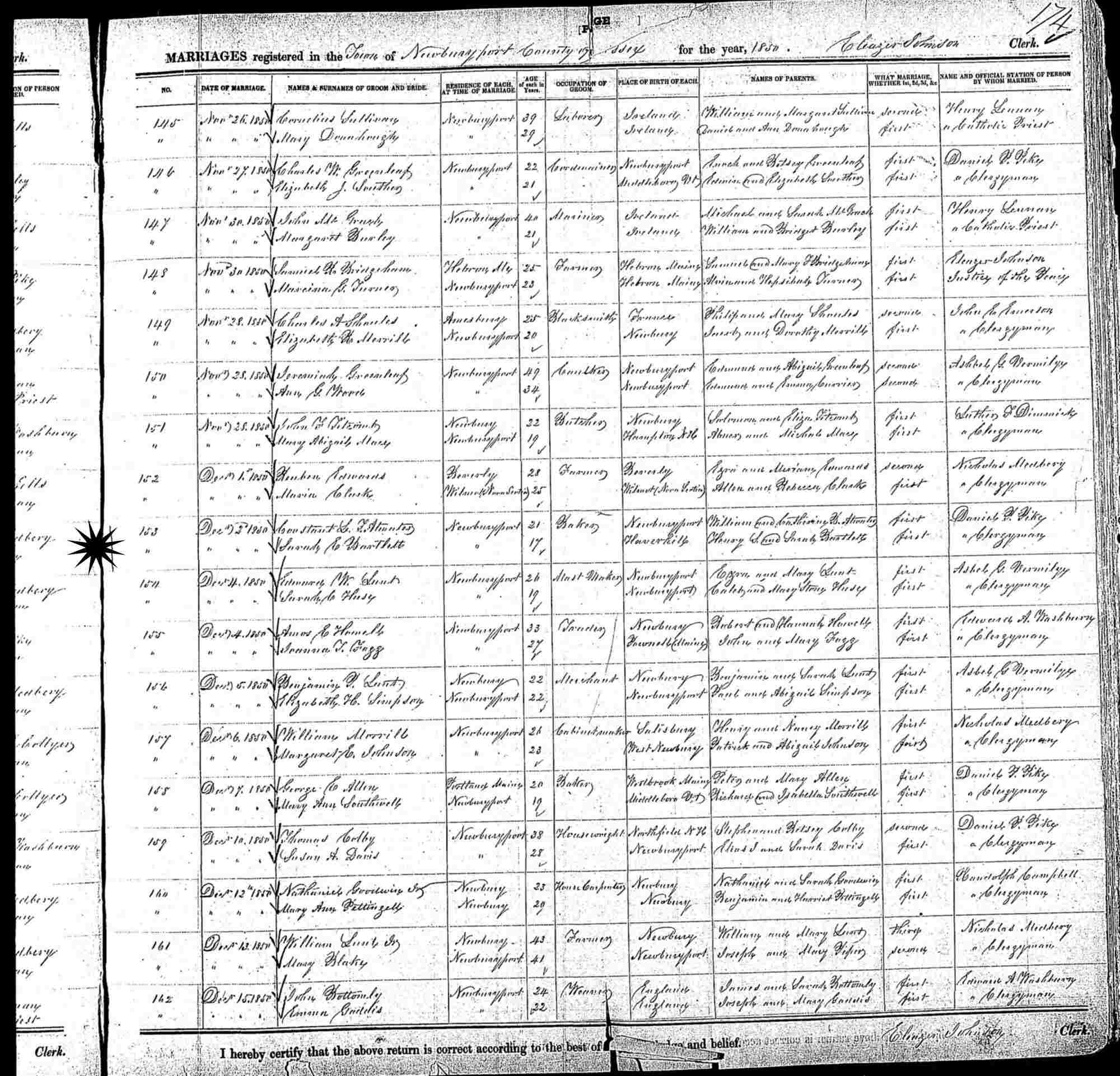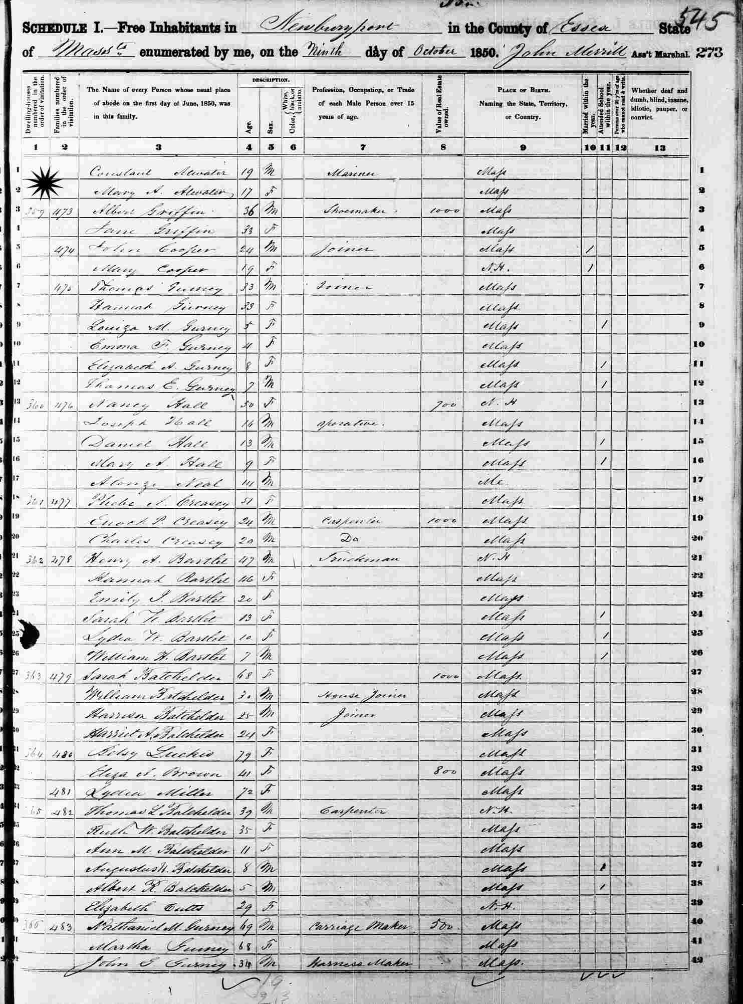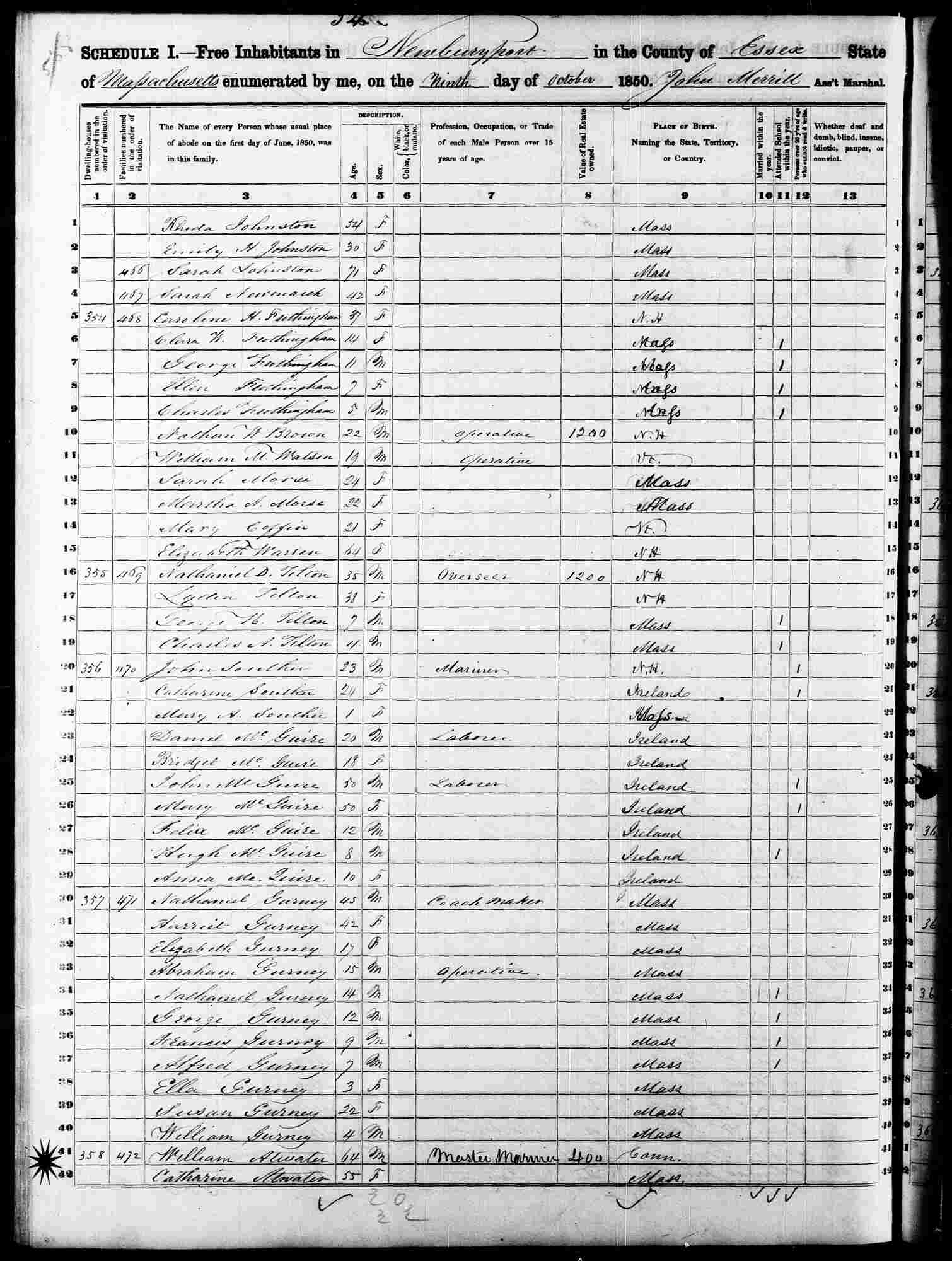 October 9, 1850 - Ward 1, Newburyport, Essex County, Massachusetts.