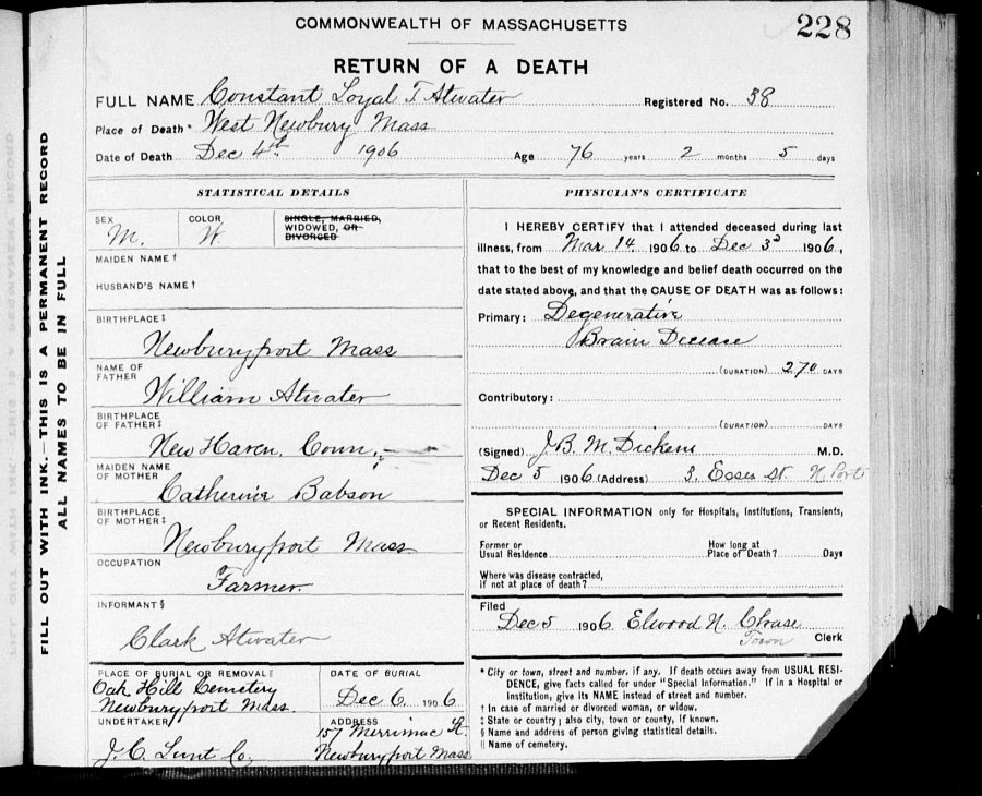 Died: December 4, 1906 in West Newbury, Essex County, Massachusetts.