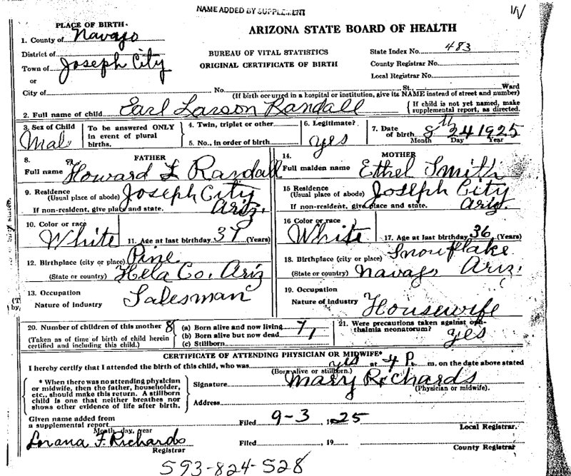 Born: August 24, 1925 in Joseph City, Navajo County, Arizona.