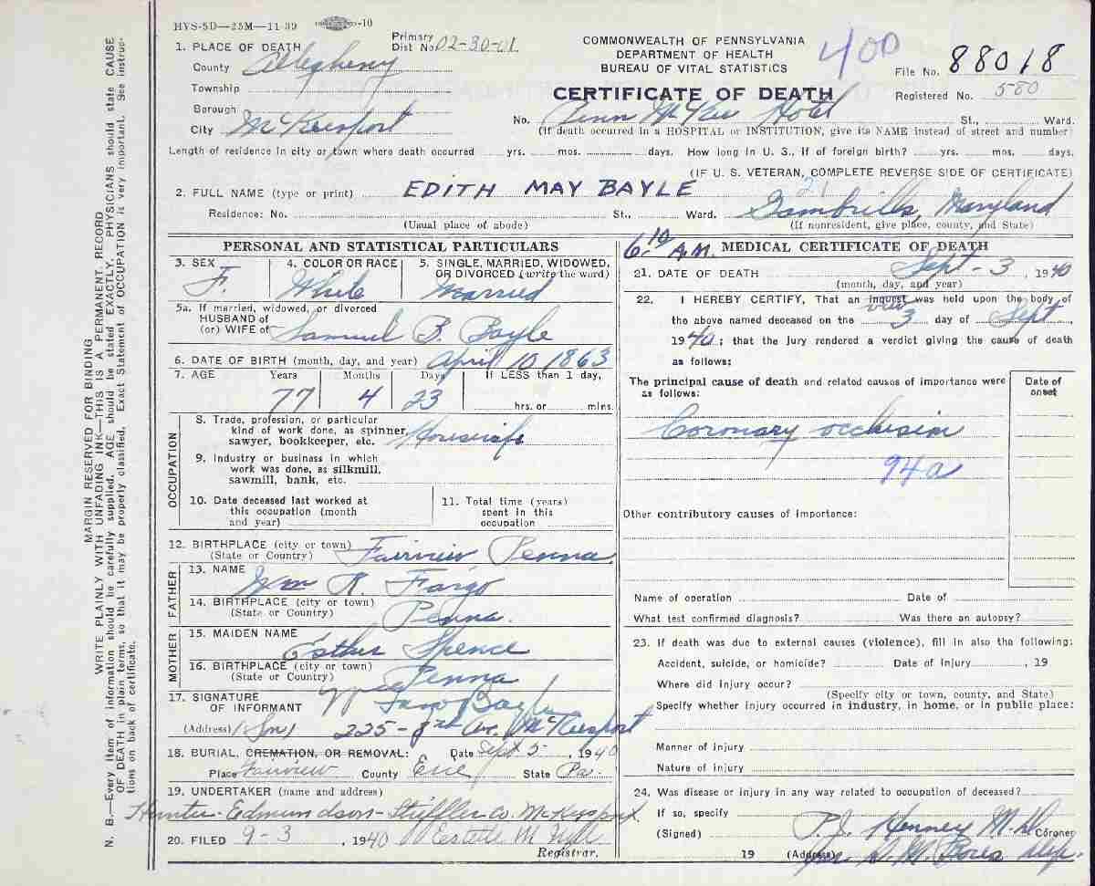 Died: September 3, 1940 in McKeesport, Allegheny County, Pennsylvania.