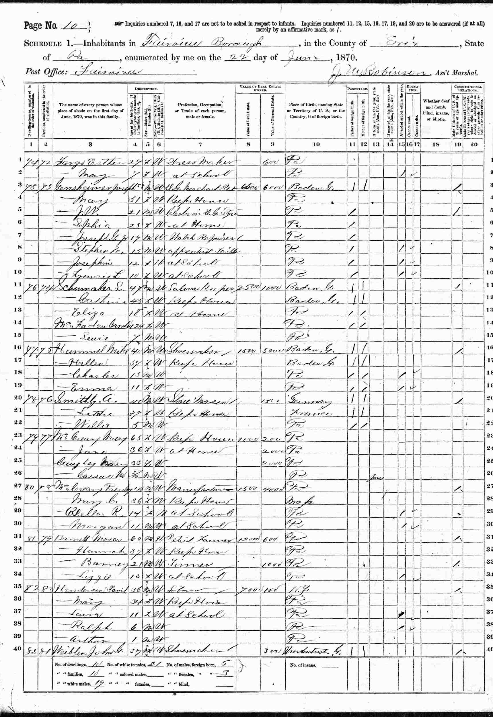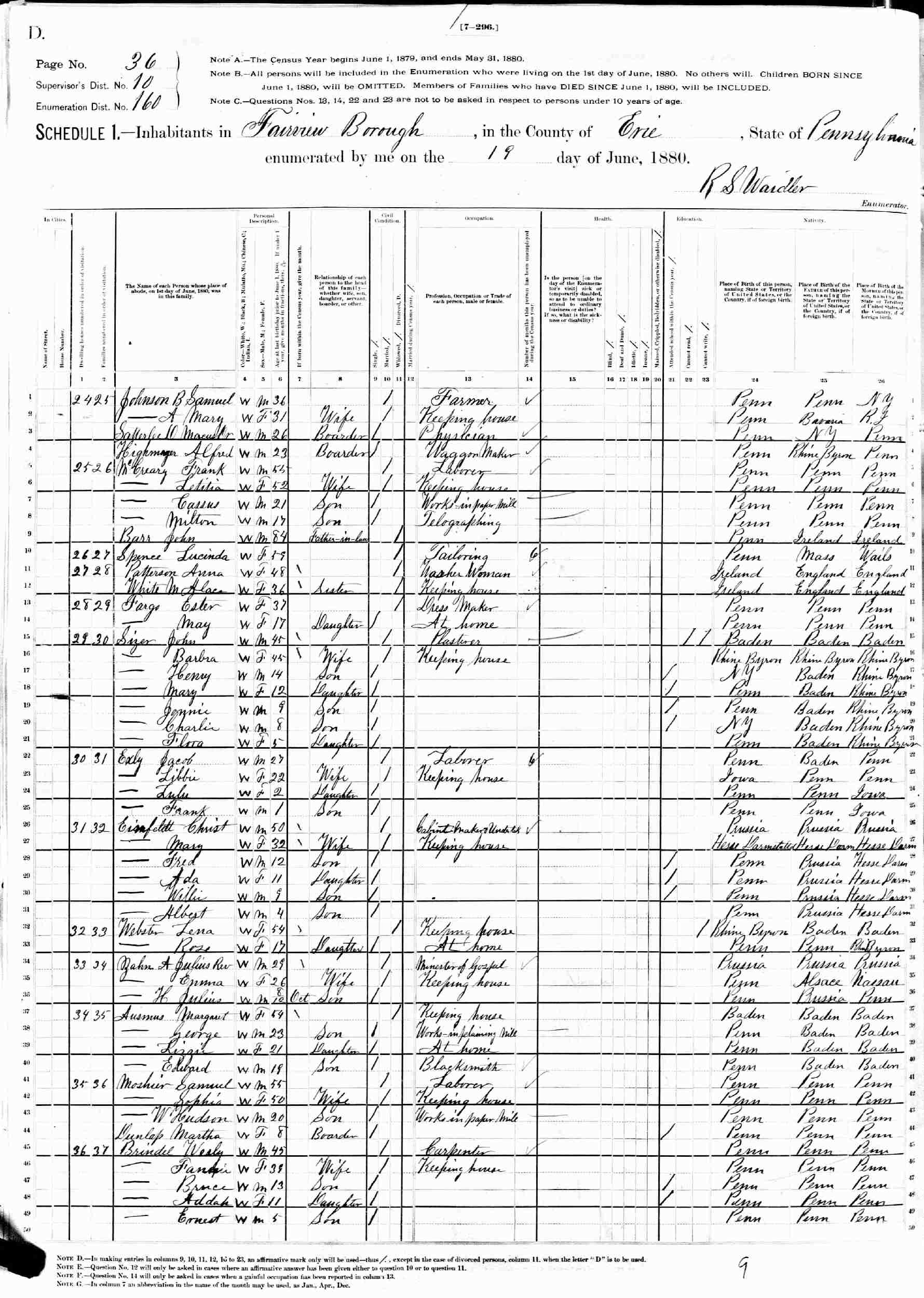 June 19, 1880 - Supervisor's District 10, Enumeration District 160, Fairvew Borough, Erie County, Pennsylvania.