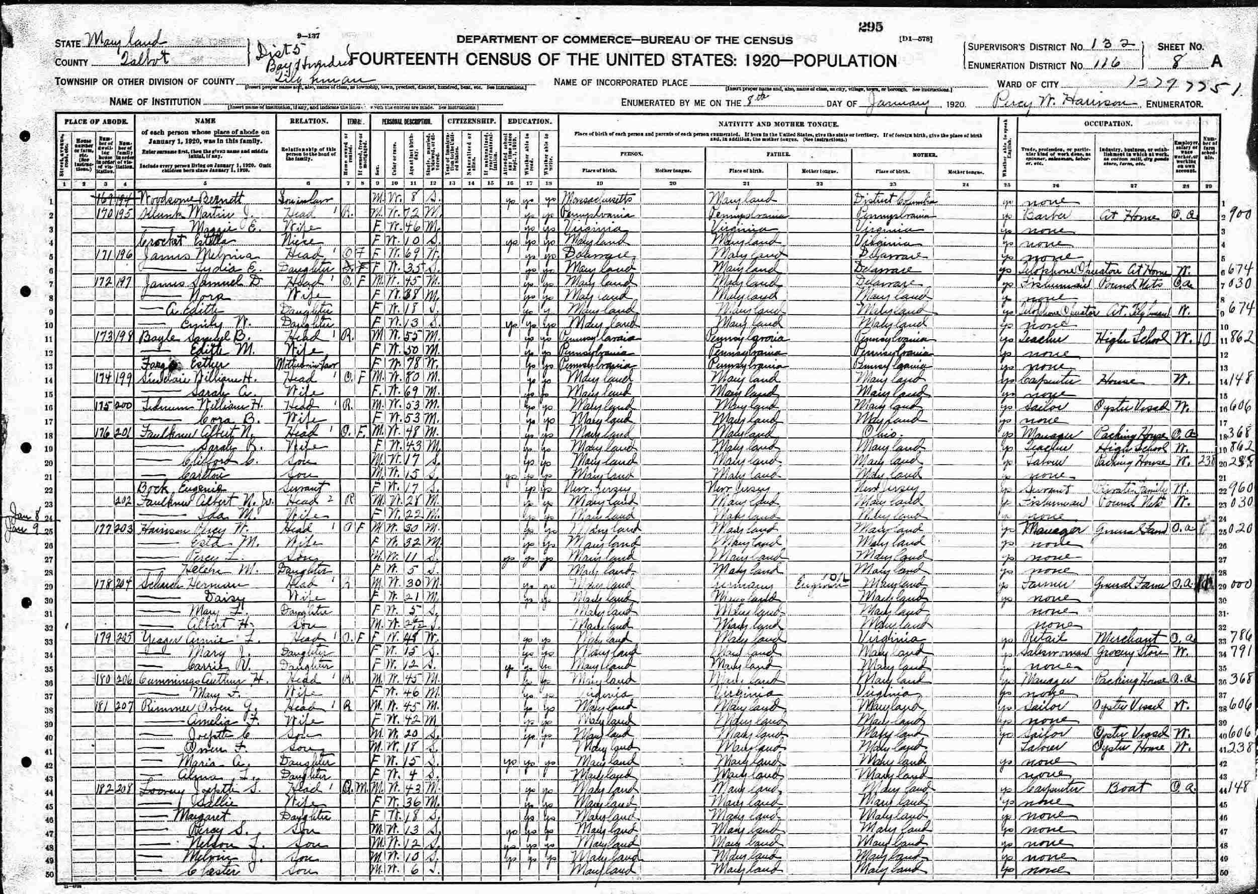 January 8, 1920 - District 5, Supervisor's District 132, Enumeration District 116, Bay Hundred, Tablot County, Maryland.