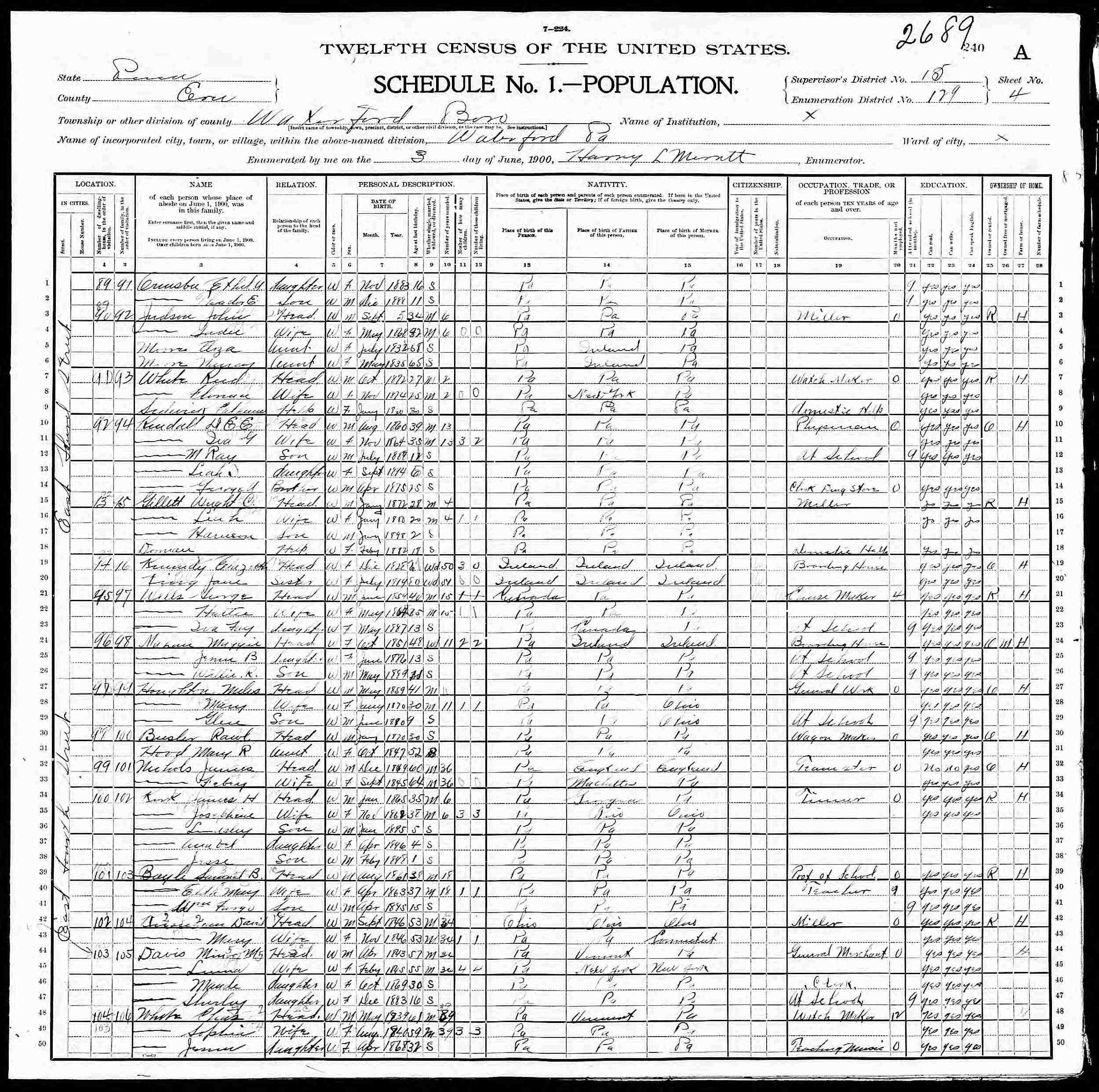 June 3, 1900 - East Fourth Street, Supervisor's District 15, Enumeration District 129, Waterford, Erie County, Pennsylvania.