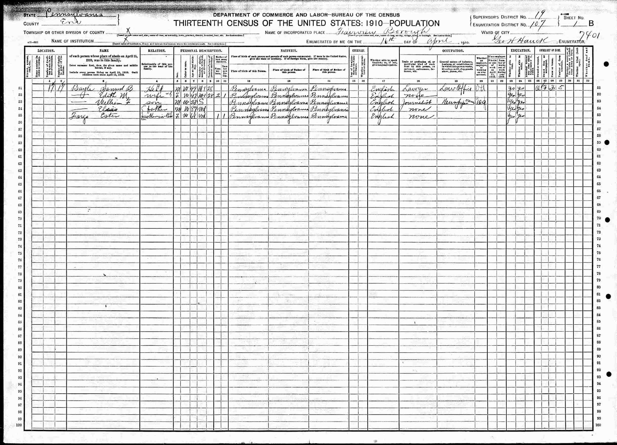 April 16, 1910 - Supervisor's District 19, Enumeratioon District 107, Fairview Borough, Erie County, Pennsylvania.