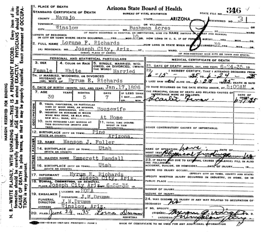 Died: June 24, 1935 in Winslow, Navajo County, Arizona.