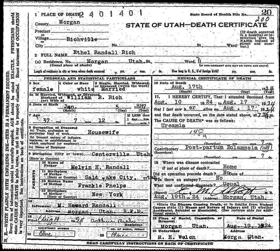 Died: August 17, 1924 in Richville, Morgan County, Utah.