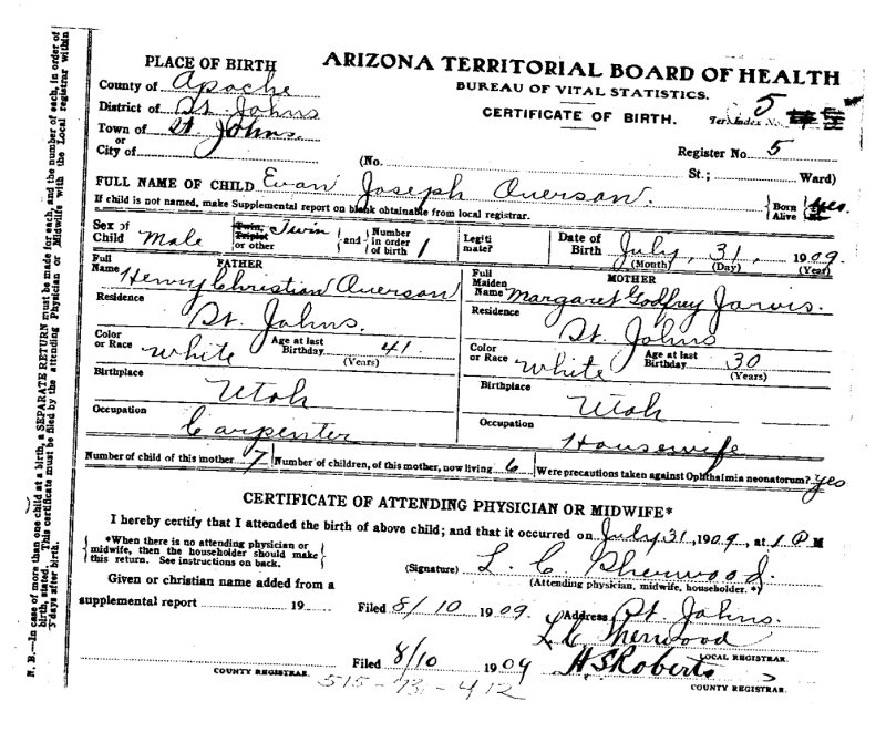 Born: July 31, 1909 in Saint Johns, Apache County, Arizona.